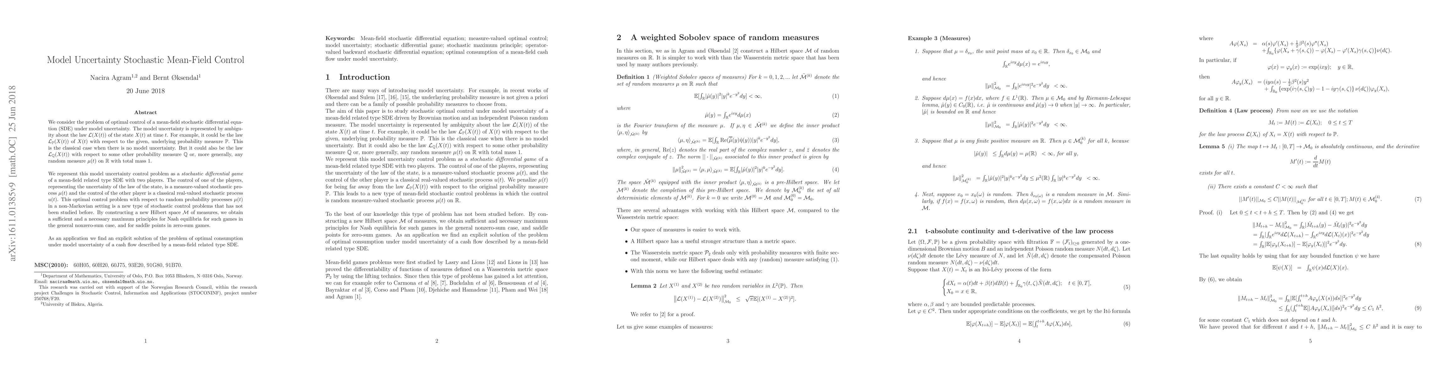 We consider the problem of optimal control of a mean-field stochastic differential equation under model uncertainty. The model uncertainty is represented by ambiguity about the law $\mathcal{L}(X(t))$ of the state $X(t)$ at time $t$. For example, it could be the law $\mathcal{L}_{\mathbb{P}}(X(t))$ of $X(t)$ with respect to the given, underlying probability measure $\mathbb{P}$. This is the classical case when there is no model uncertainty. But it could also be the law $\mathcal{L}_{\mathbb{Q}}(X(t))$ with respect to some other probability measure $\mathbb{Q}$ or, more generally, any random measure $\mu(t)$ on $\mathbb{R}$ with total mass $1$. We represent this model uncertainty control problem as a stochastic differential game of a mean-field related type stochastic differential equation (SDE) with two players. The control of one of the players, representing the uncertainty of the law of the state, is a measure valued stochastic process $\mu(t)$ and the control of the other player is a classical real-valued stochastic process $u(t)$. This control with respect to random probability processes $\mu(t)$ on $\mathbb{R}$ is a new type of stochastic control problems that has not been studied before. By introducing operator-valued backward stochastic differential equations, we obtain a sufficient maximum principle for Nash equilibria for such games in the general nonzero-sum case, and saddle points for zero-sum games. As an application we find an explicit solution of the problem of optimal consumption under model uncertainty of a cash flow described by a mean-field related type SDE.