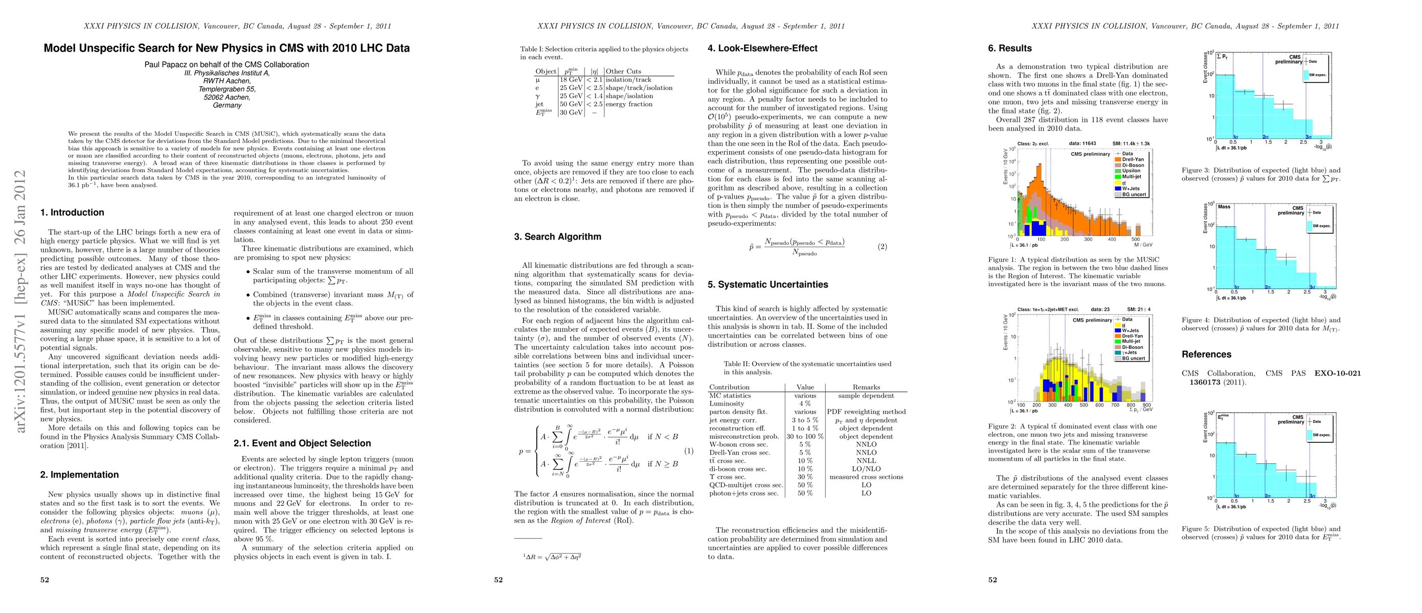We present the results of the Model Unspecific Search in CMS (MUSiC), which systematically scans the data taken by the CMS detector for deviations from the Standard Model predictions. Due to the minimal theoretical bias this approach is sensitive to a variety of models for new physics. Events containing at least one electron or muon are classified according to their content of reconstructed objects (muons, electrons, photons, jets and missing transverse energy). A broad scan of three kinematic distributions in those classes is performed by identifying deviations from Standard Model expectations, accounting for systematic uncertainties. In this particular search data taken by CMS in the year 2010, corresponding to an integrated luminosity of 36.1/pb, have been analysed.