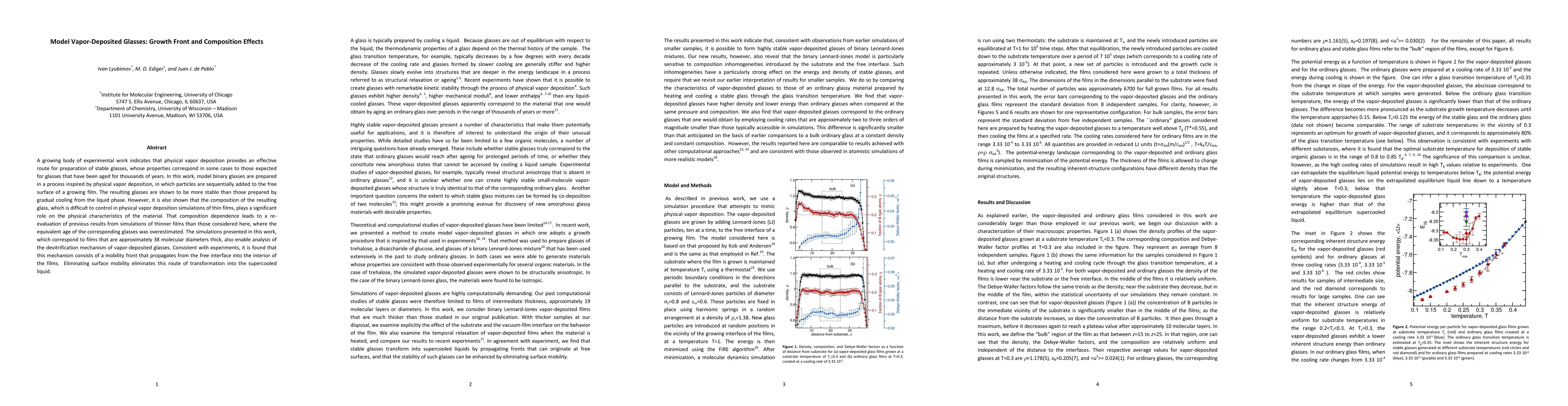 This research investigates model binary glasses prepared via a vapor deposition-inspired process, demonstrating their enhanced stability compared to glasses cooled from the liquid phase. The study highlights that composition significantly influences the material's properties, leading to a reassessment of prior simulations involving thinner films, and reveals a devitrification mechanism characterized by a mobility front propagating from the surface into the film's interior.
