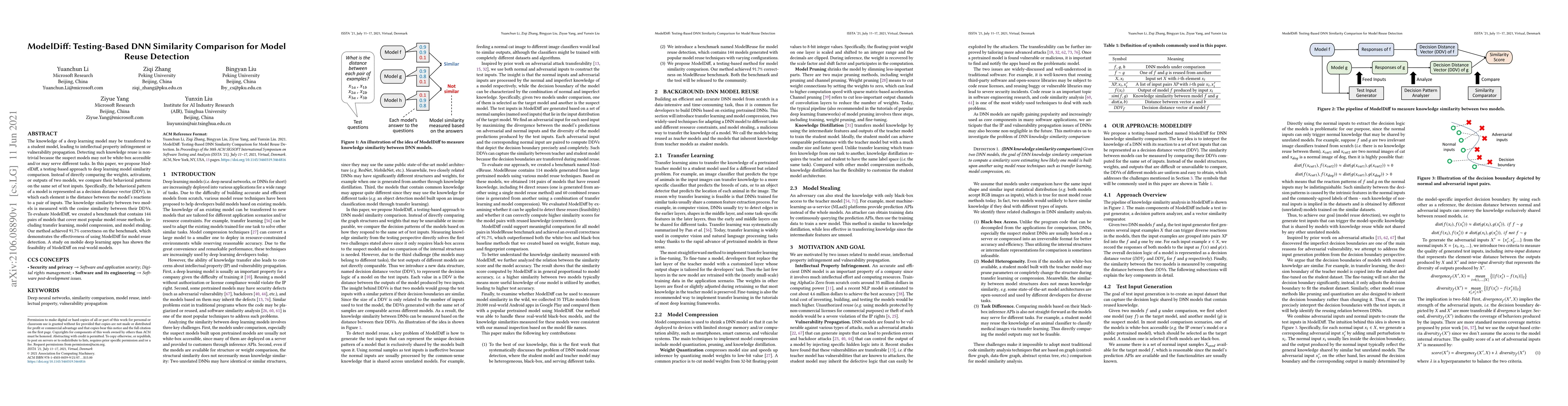 The knowledge of a deep learning model may be transferred to a student model, leading to intellectual property infringement or vulnerability propagation. Detecting such knowledge reuse is nontrivial because the suspect models may not be white-box accessible and/or may serve different tasks. In this paper, we propose ModelDiff, a testing-based approach to deep learning model similarity comparison. Instead of directly comparing the weights, activations, or outputs of two models, we compare their behavioral patterns on the same set of test inputs. Specifically, the behavioral pattern of a model is represented as a decision distance vector (DDV), in which each element is the distance between the model's reactions to a pair of inputs. The knowledge similarity between two models is measured with the cosine similarity between their DDVs. To evaluate ModelDiff, we created a benchmark that contains 144 pairs of models that cover most popular model reuse methods, including transfer learning, model compression, and model stealing. Our method achieved 91.7% correctness on the benchmark, which demonstrates the effectiveness of using ModelDiff for model reuse detection. A study on mobile deep learning apps has shown the feasibility of ModelDiff on real-world models.