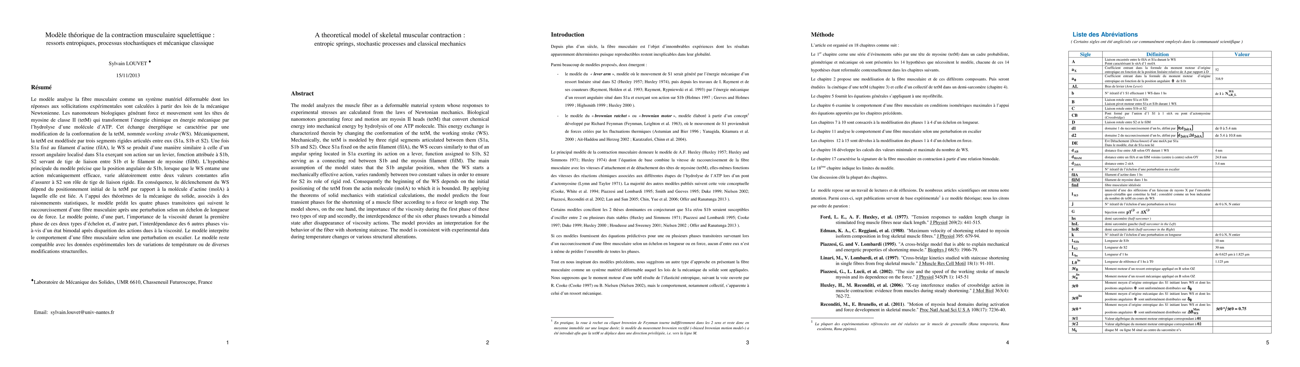 The model analyzes the muscle fiber as a deformable system for which experimental data are determinated with the help of the laws of Newtonian mechanic. The model predicts the four transient phases for the shortening of a muscle fiber according to a force or length step. The model shows, on the one hand, the importance of the viscosity during the first phase of these two types of step and, secondly, the interdependence of the six other phases towards a bimodal state after disappearance of actions due to viscosity. The model provides an interpretation for the behavior of a fiber with shortening staircase. The model is consistent with experimental data during temperature changes or various structural alterations.