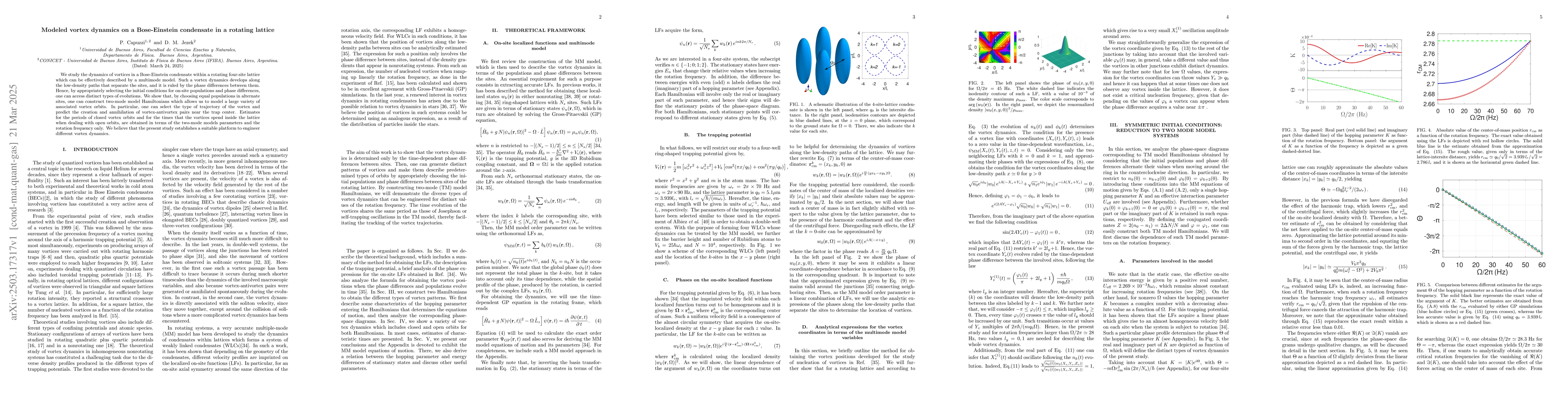 The study employs a multimode model to describe vortex dynamics in a Bose-Einstein condensate within a rotating four-site lattice, analyzing phase-space diagrams and Hamiltonians for different initial conditions.