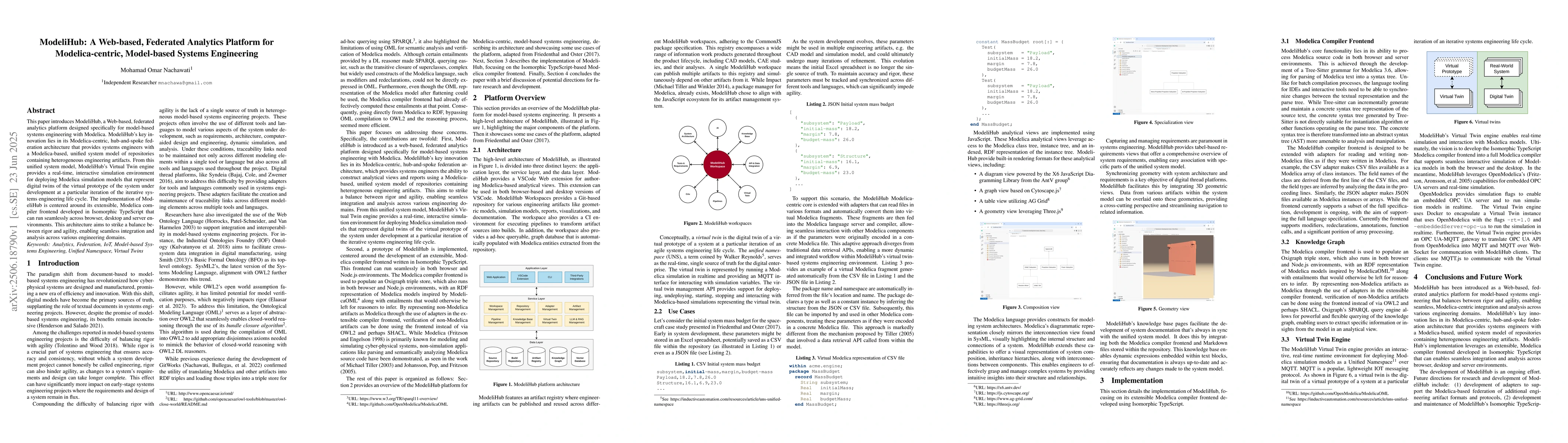 This paper introduces ModeliHub, a Web-based, federated analytics platform designed specifically for model-based systems engineering with Modelica. ModeliHub's key innovation lies in its Modelica-centric, hub-and-spoke federation architecture that provides systems engineers with a Modelica-based, unified system model of repositories containing heterogeneous engineering artifacts. From this unified system model, ModeliHub's Virtual Twin engine provides a real-time, interactive simulation environment for deploying Modelica simulation models that represent digital twins of the virtual prototype of the system under development at a particular iteration of the iterative systems engineering life cycle. The implementation of ModeliHub is centered around its extensible, Modelica compiler frontend developed in Isomorphic TypeScript that can run seamlessly across browser, desktop and server environments. This architecture aims to strike a balance between rigor and agility, enabling seamless integration and analysis across various engineering domains.