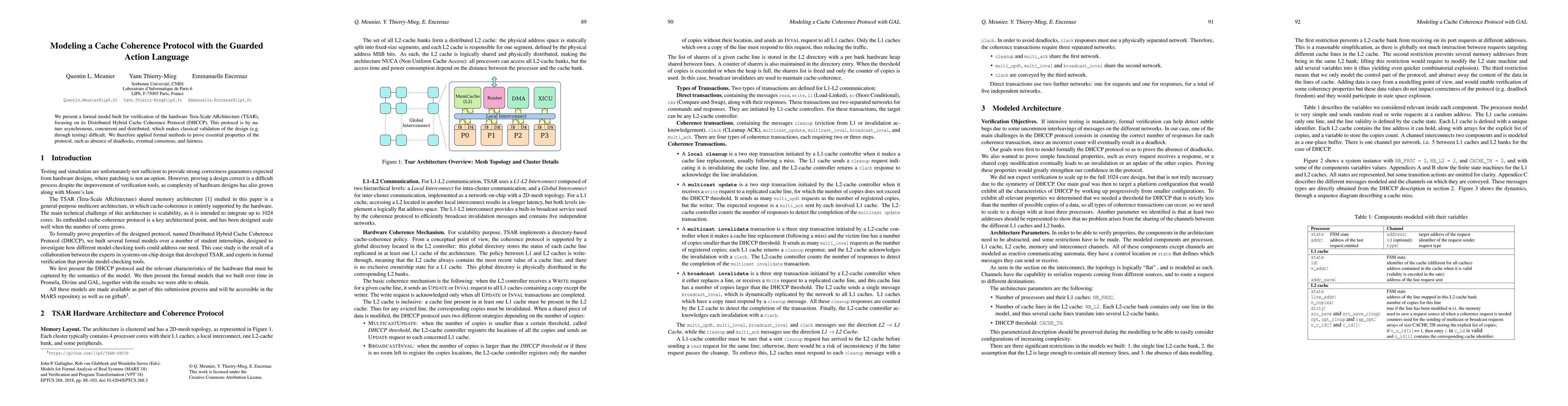 We present a formal model built for verification of the hardware Tera-Scale ARchitecture (TSAR), focusing on its Distributed Hybrid Cache Coherence Protocol (DHCCP). This protocol is by nature asynchronous, concurrent and distributed, which makes classical validation of the design (e.g. through testing) difficult. We therefore applied formal methods to prove essential properties of the protocol, such as absence of deadlocks, eventual consensus, and fairness.