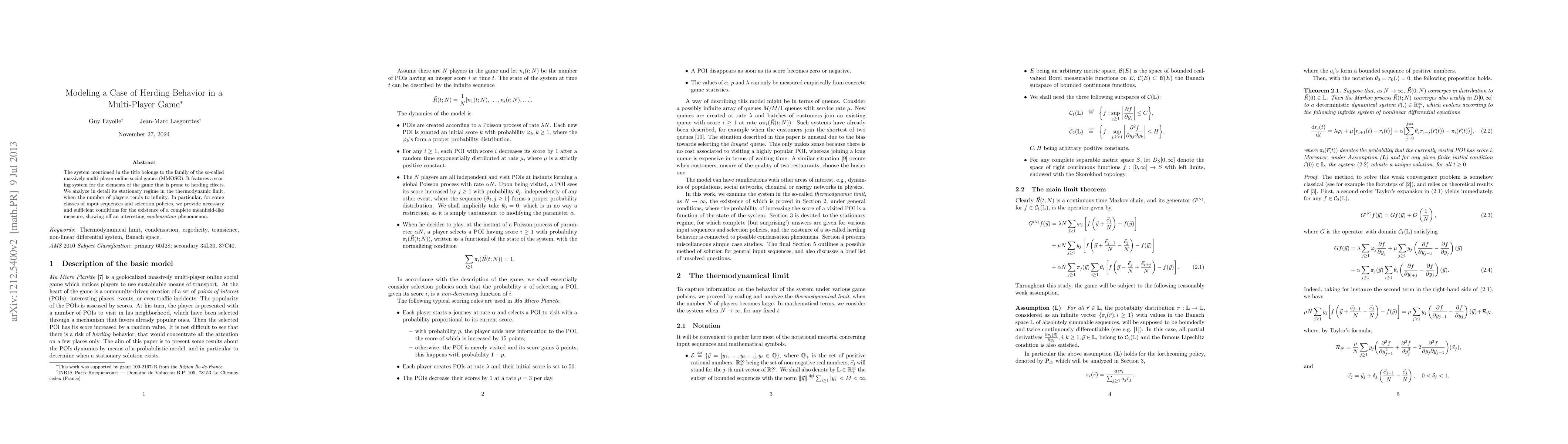 Researchers studied herding behavior in a multiplayer game with infinite players, finding conditions for a stable statistical measure that exhibits interesting condensation phenomena. They identified necessary and sufficient criteria for the existence of this measure in certain scenarios.
