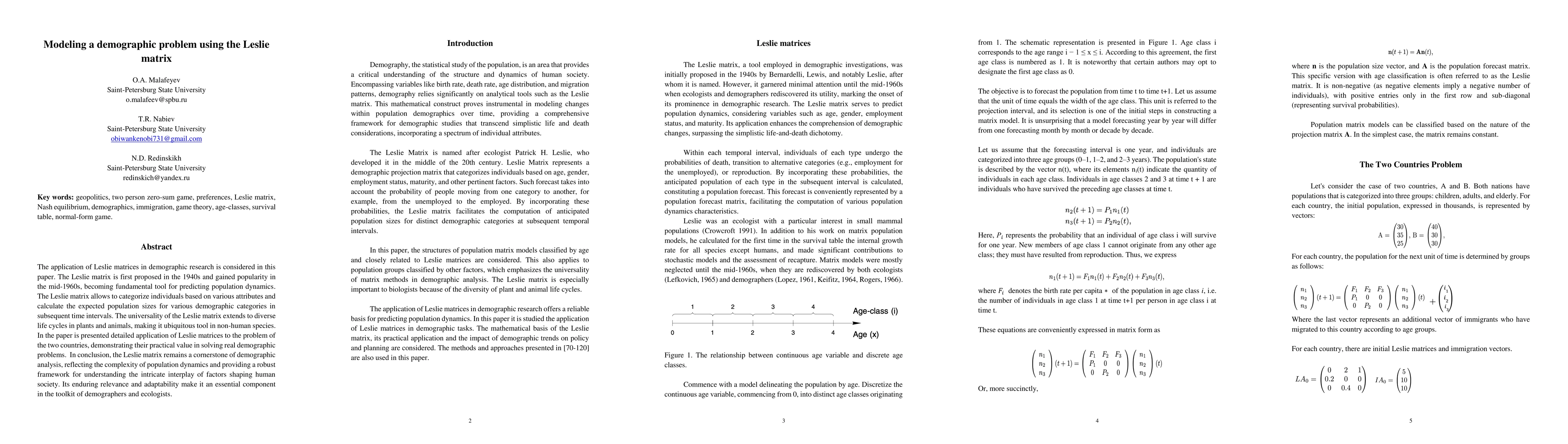 The application of Leslie matrices in demographic research is considered in this paper. The Leslie matrix is first proposed in the 1940s and gained popularity in the mid-1960s, becoming fundamental tool for predicting population dynamics. The Leslie matrix allows to categorize individuals based on various attributes and calculate the expected population sizes for various demographic categories in subsequent time intervals. The universality of the Leslie matrix extends to diverse life cycles in plants and animals, making it ubiquitous tool in non-human species. In the paper is presented detailed application of Leslie matrices to the problem of the two countries, demonstrating their practical value in solving real demographic problems. In conclusion, the Leslie matrix remains a cornerstone of demographic analysis, reflecting the complexity of population dynamics and providing a robust framework for understanding the intricate interplay of factors shaping human society. Its enduring relevance and adaptability make it an essential component in the toolkit of demographers and ecologists.