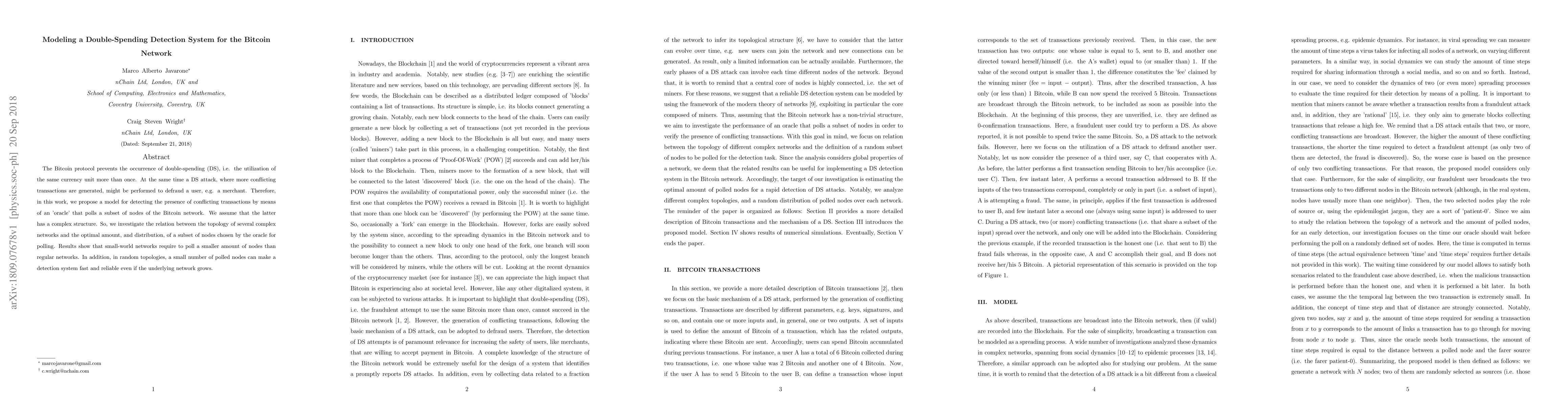 This paper proposes a double-spending detection model for the Bitcoin network using an 'oracle' that polls a subset of nodes. It finds that small-world network topologies require fewer nodes to be polled compared to regular networks, and random topologies can maintain fast and reliable detection with a small number of nodes.