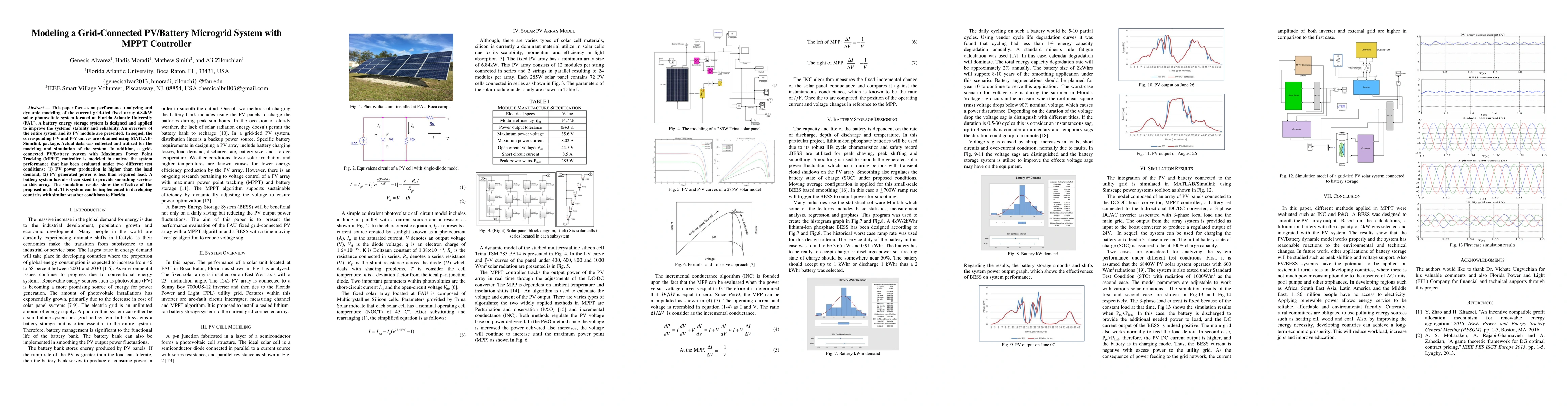 This paper models a grid-connected PV/battery microgrid system with an MPPT controller, analyzing its performance under varying load conditions. The study demonstrates the system's stability and reliability improvements through battery energy storage, validated by simulations using actual data collected from a 6.84kW solar array at Florida Atlantic University.