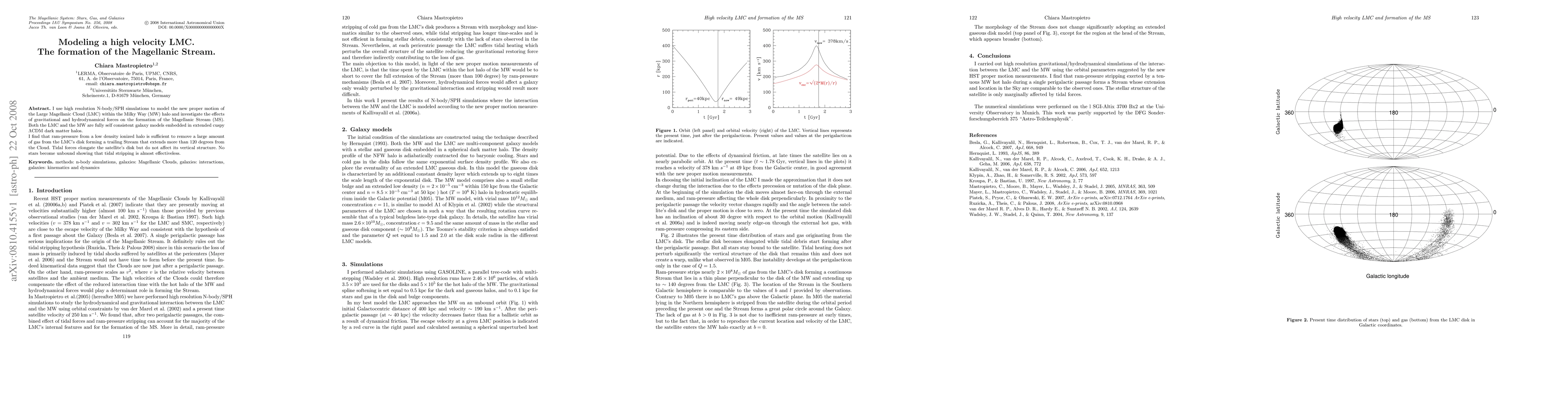 I use high resolution N-body/SPH simulations to model the new proper motion of the Large Magellanic Cloud (LMC) within the Milky Way (MW) halo and investigate the effects of gravitational and hydrodynamical forces on the formation of the Magellanic Stream (MS). Both the LMC and the MW are fully self consistent galaxy models embedded in extended cuspy LCDM dark matter halos. I find that ram-pressure from a low density ionized halo is sufficient to remove a large amount of gas from the LMC's disk forming a trailing Stream that extends more than 120 degrees from the Cloud. Tidal forces elongate the satellite's disk but do not affect its vertical structure. No stars become unbound showing that tidal stripping is almost effectiveless.