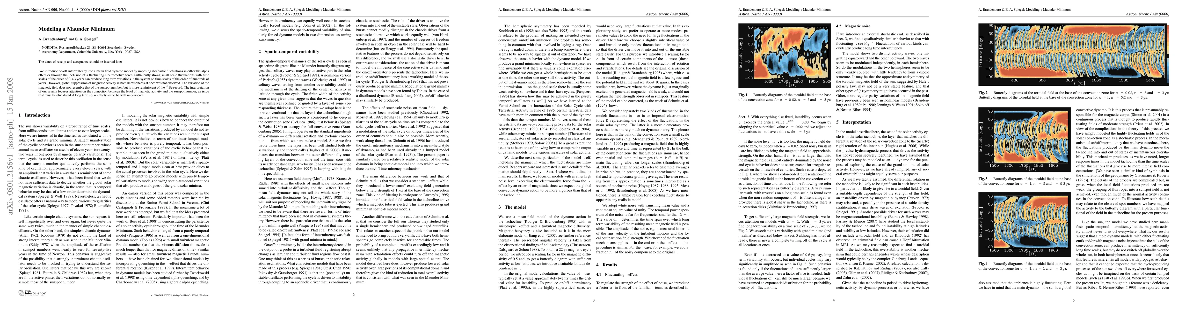 We introduce on/off intermittency into a mean field dynamo model by imposing stochastic fluctuations in either the alpha effect or through the inclusion of a fluctuating electromotive force. Sufficiently strong small scale fluctuations with time scales of the order of 0.3-3 years can produce long term variations in the system on time scales of the order of hundreds of years. However, global suppression of magnetic activity in both hemispheres at once was not observed. The variation of the magnetic field does not resemble that of the sunspot number, but is more reminiscent of the 10 Be record. The interpretation of our results focuses attention on the connection between the level of magnetic activity and the sunspot number, an issue that must be elucidated if long term solar effects are to be well understood.
