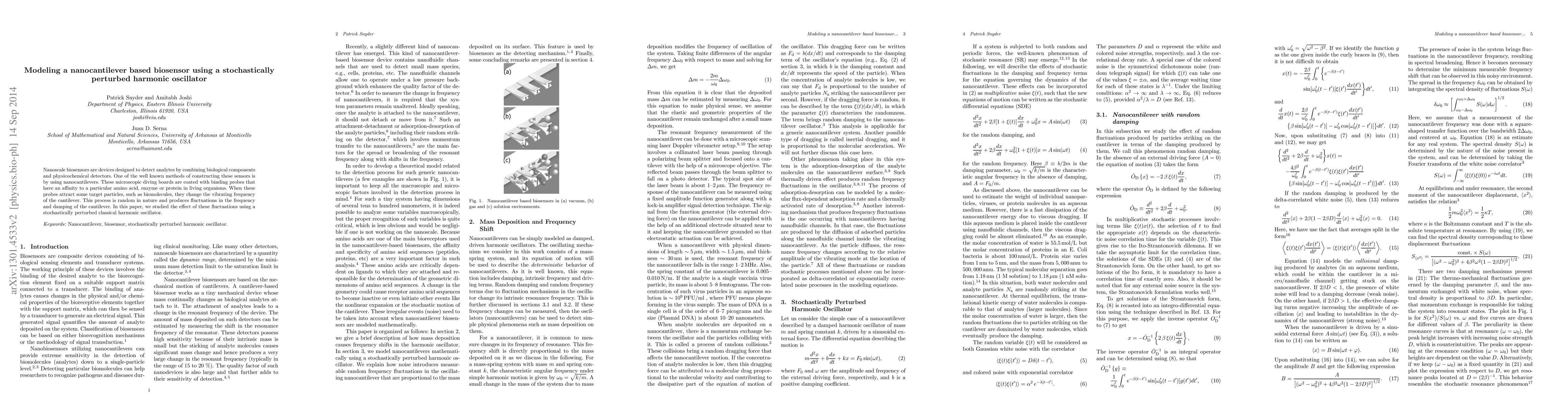Nanoscale biosensors are devices designed to detect analytes by combining biological components and physicochemical detectors. One of the well known methods of constructing these sensors is by using nanocantilevers. These microscopic 'diving boards' are coated with binding probes that have an affinity to a particular amino acid, enzyme or protein in living organisms. When these probes attract some target particles, such as biomolecules, they change the vibrating frequency of the cantilever. This process is random in nature and produces fluctuations in the frequency and damping of the cantilever. In this paper, we studied the effect of these fluctuations using a stochastically perturbed classical harmonic oscillator.