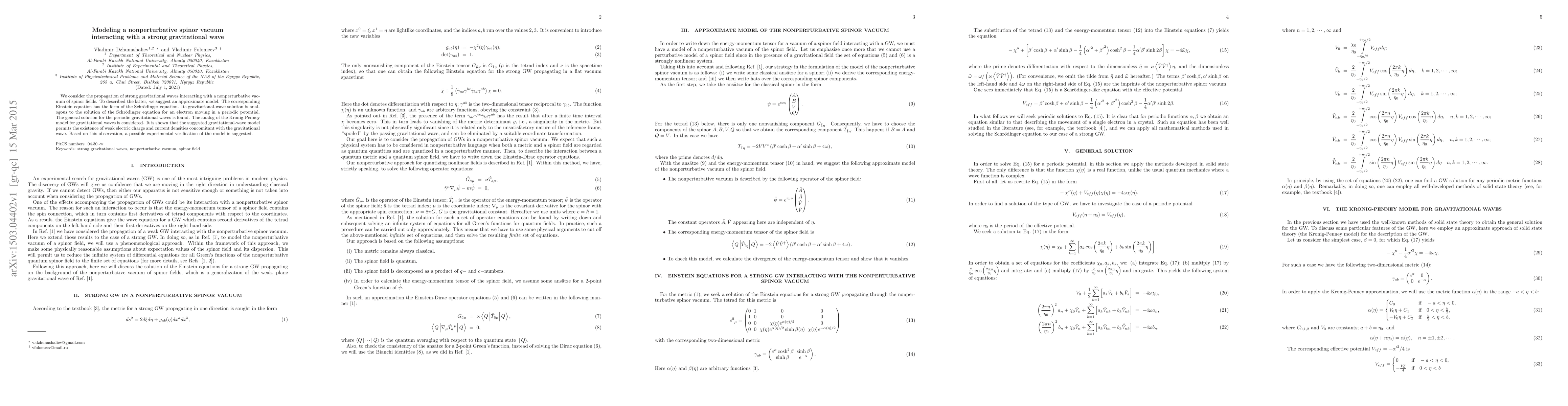 This paper models the interaction of strong gravitational waves with a nonperturbative spinor vacuum, proposing an approximate model where the Einstein equation resembles the Schrödinger equation. It finds a general solution for periodic gravitational waves and suggests experimental verification based on the existence of weak electric charge and current densities.