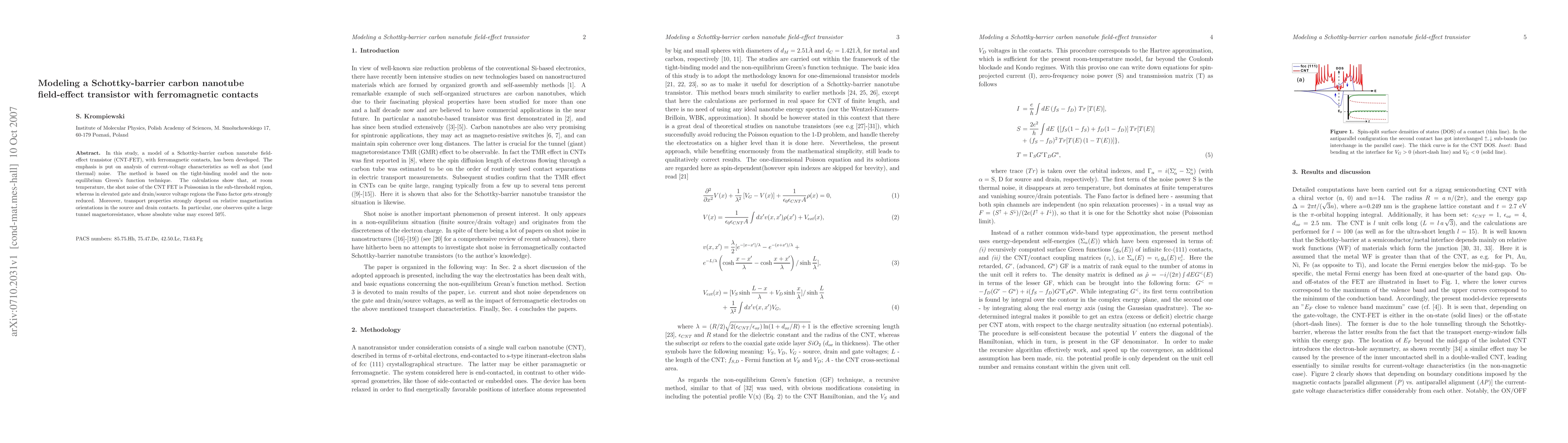 This study models a Schottky-barrier carbon nanotube field-effect transistor with ferromagnetic contacts, focusing on current-voltage characteristics and noise analysis. The results indicate Poissonian shot noise in the sub-threshold region and significant tunnel magnetoresistance exceeding 50%, depending on contact magnetization.