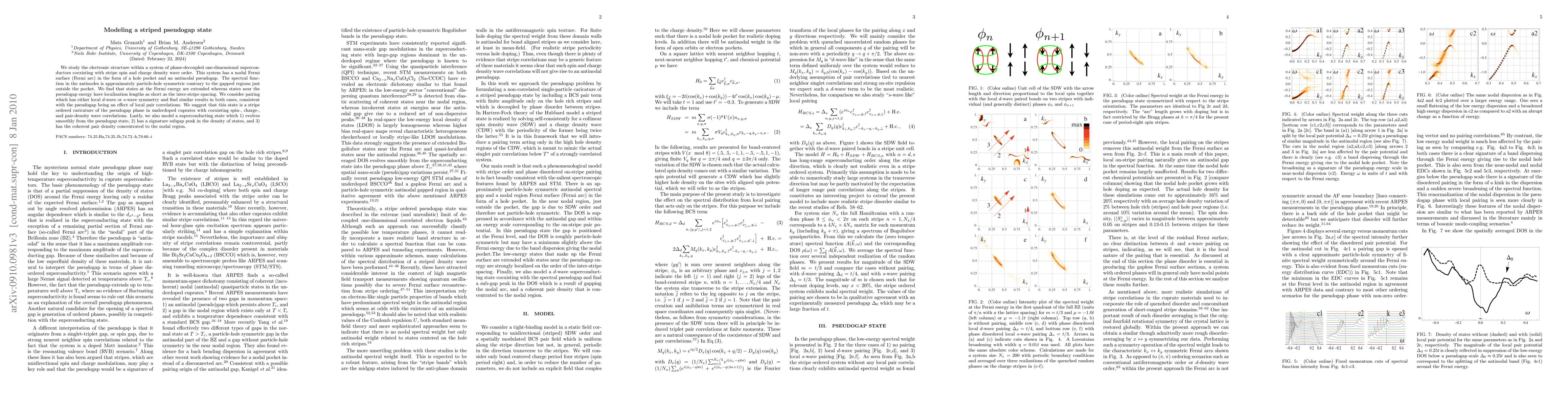 The research employs a model of phase-decoupled one-dimensional superconductors coexisting with stripe spin and charge density wave order, studied via spectral function analysis and pairing symmetry considerations.