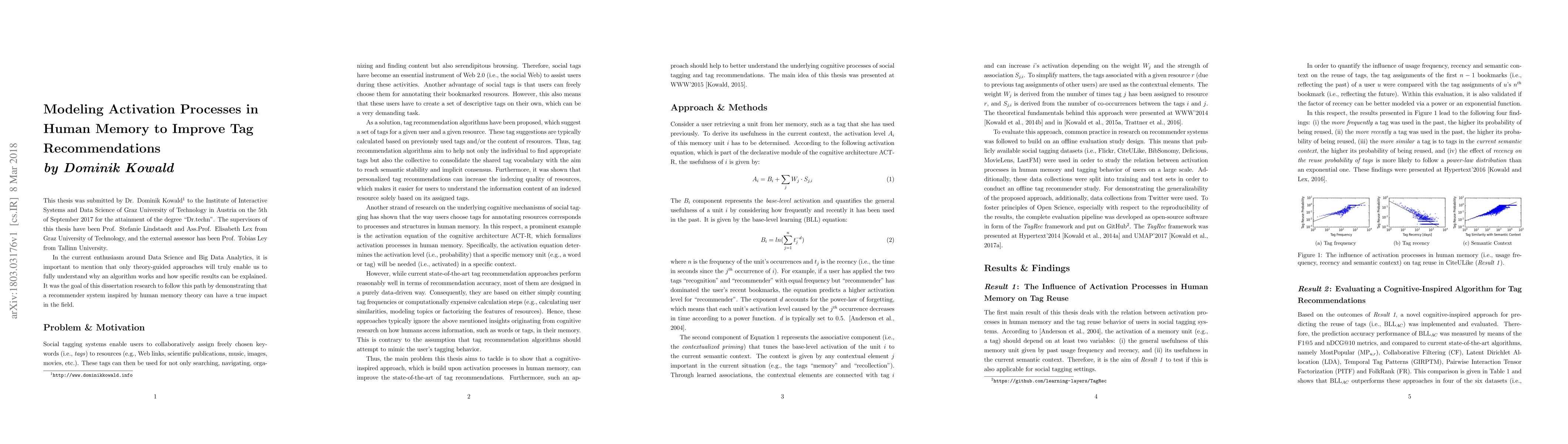This thesis was submitted by Dr. Dominik Kowald to the Institute of Interactive Systems and Data Science of Graz University of Technology in Austria on the 5th of September 2017 for the attainment of the degree 'Dr.techn'. The supervisors of this thesis have been Prof. Stefanie Lindstaedt and Ass.Prof. Elisabeth Lex from Graz University of Technology, and the external assessor has been Prof. Tobias Ley from Tallinn University. In the current enthusiasm around Data Science and Big Data Analytics, it is important to mention that only theory-guided approaches will truly enable us to fully understand why an algorithm works and how specific results can be explained. It was the goal of this dissertation research to follow this path by demonstrating that a recommender system inspired by human memory theory can have a true impact in the field.