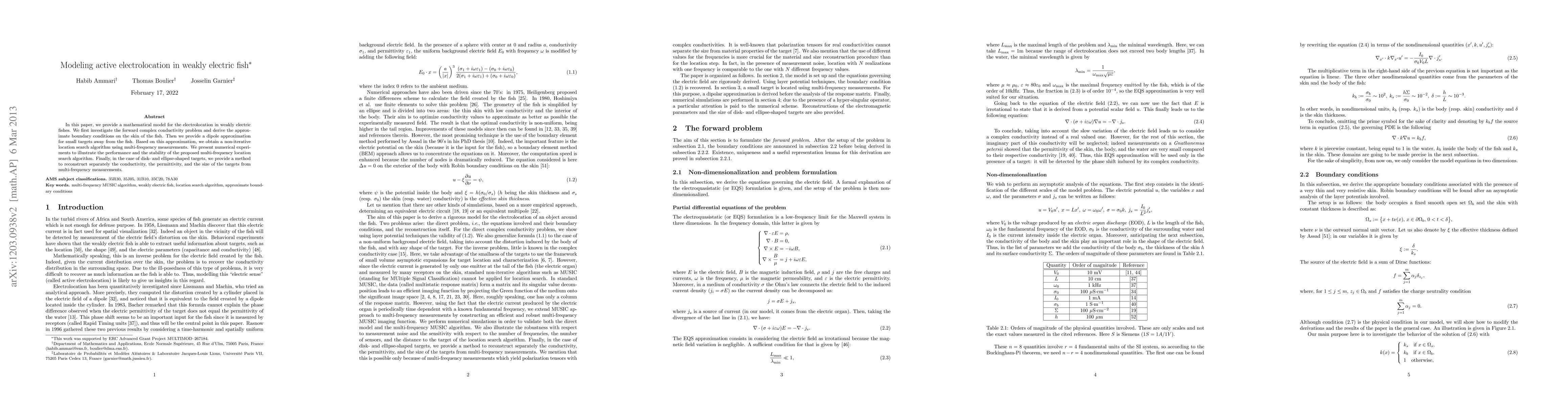 In this paper, we provide a mathematical model for the electrolocation in weakly electric fishes. We first investigate the forward complex conductivity problem and derive the approximate boundary conditions on the skin of the fish. Then we provide a dipole approximation for small targets away from the fish. Based on this approximation, we obtain a non-iterative location search algorithm using multi-frequency measurements. We present numerical experiments to illustrate the performance and the stability of the proposed multi-frequency location search algorithm. Finally, in the case of disk- and ellipse-shaped targets, we provide a method to reconstruct separately the conductivity, the permittivity, and the size of the targets from multi-frequency measurements.