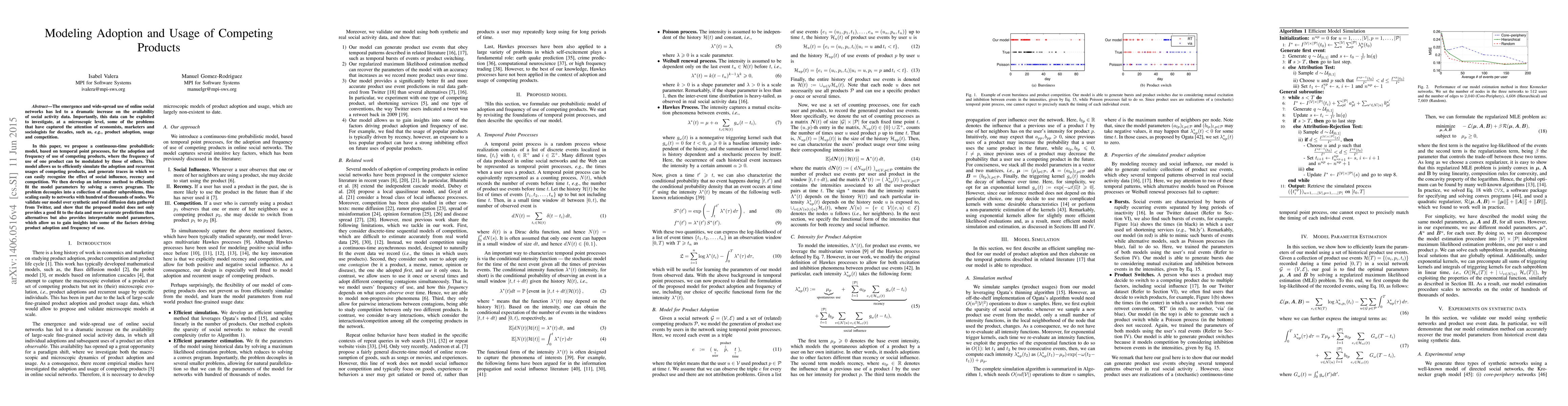 This paper proposes a continuous-time probabilistic model for simulating the adoption and usage of competing products, based on temporal point processes and social influence factors. The model is validated on Twitter data, demonstrating superior fit and interpretability compared to alternatives.