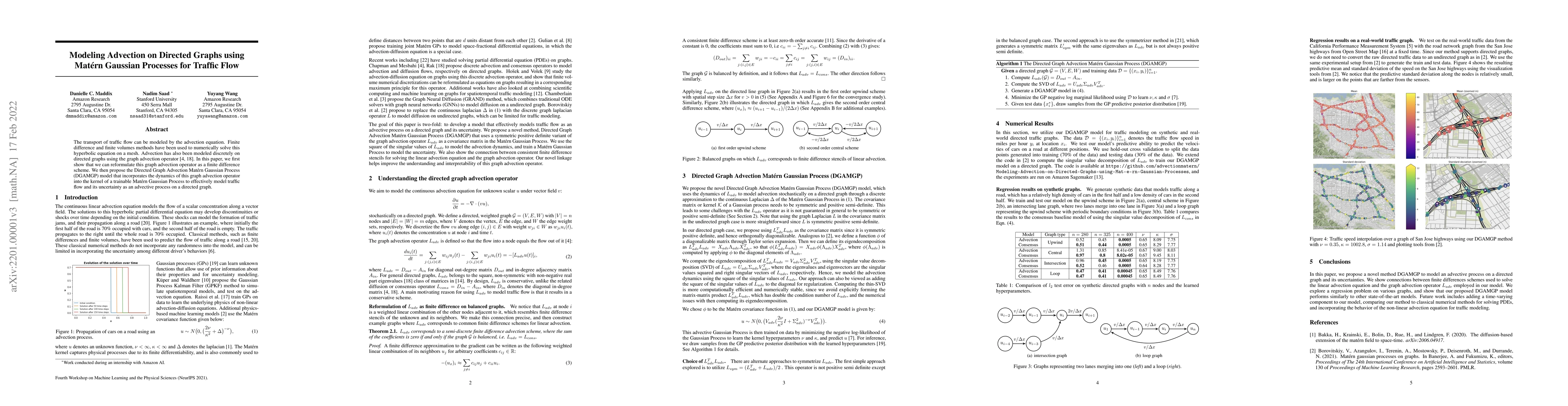 This paper reformulates the graph advection operator as a finite difference scheme and introduces the Directed Graph Advection Matérn Gaussian Process (DGAMGP) model to model traffic flow dynamics and uncertainty on directed graphs using Matérn Gaussian Processes.