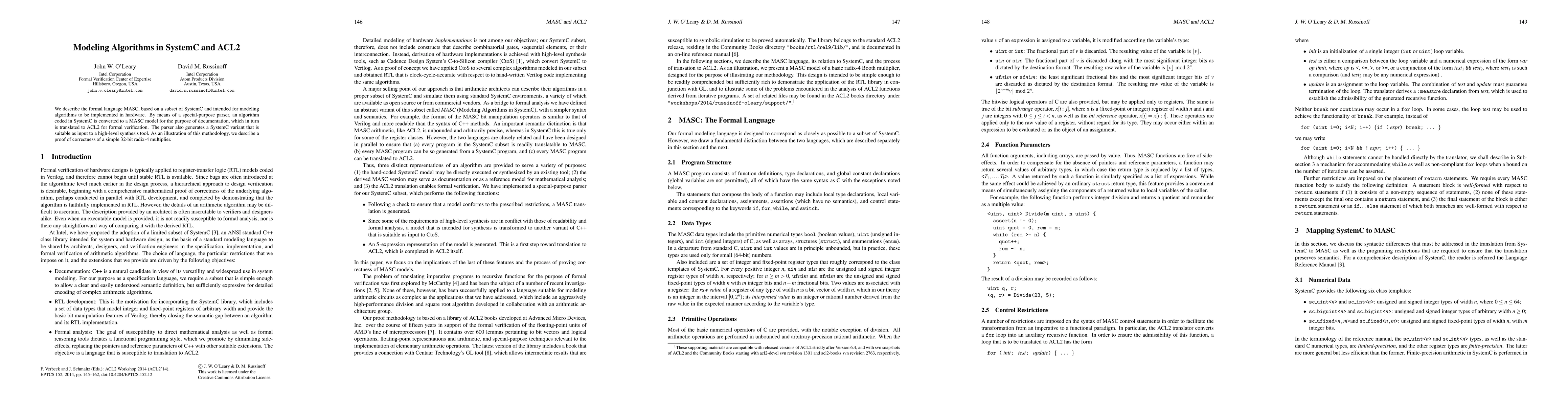 We describe the formal language MASC, based on a subset of SystemC and intended for modeling algorithms to be implemented in hardware. By means of a special-purpose parser, an algorithm coded in SystemC is converted to a MASC model for the purpose of documentation, which in turn is translated to ACL2 for formal verification. The parser also generates a SystemC variant that is suitable as input to a high-level synthesis tool. As an illustration of this methodology, we describe a proof of correctness of a simple 32-bit radix-4 multiplier.