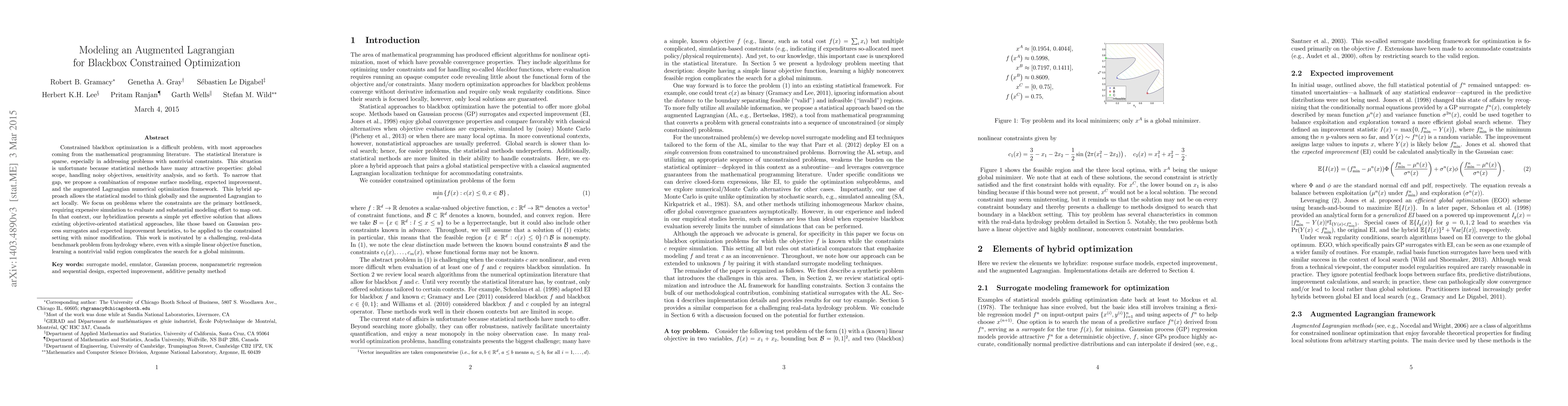 Constrained blackbox optimization is a difficult problem, with most approaches coming from the mathematical programming literature. The statistical literature is sparse, especially in addressing problems with nontrivial constraints. This situation is unfortunate because statistical methods have many attractive properties: global scope, handling noisy objectives, sensitivity analysis, and so forth. To narrow that gap, we propose a combination of response surface modeling, expected improvement, and the augmented Lagrangian numerical optimization framework. This hybrid approach allows the statistical model to think globally and the augmented Lagrangian to act locally. We focus on problems where the constraints are the primary bottleneck, requiring expensive simulation to evaluate and substantial modeling effort to map out. In that context, our hybridization presents a simple yet effective solution that allows existing objective-oriented statistical approaches, like those based on Gaussian process surrogates and expected improvement heuristics, to be applied to the constrained setting with minor modification. This work is motivated by a challenging, real-data benchmark problem from hydrology where, even with a simple linear objective function, learning a nontrivial valid region complicates the search for a global minimum.