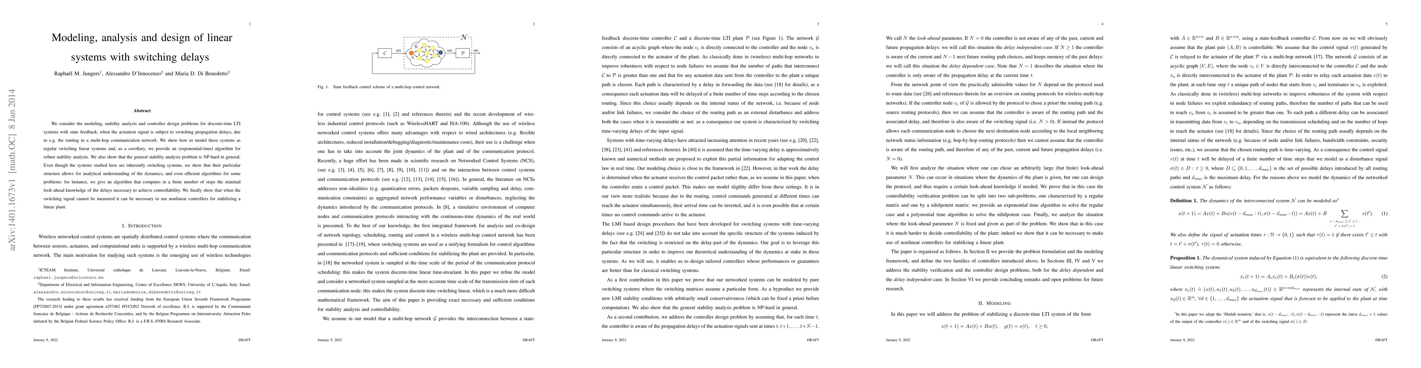 We consider the modeling, stability analysis and controller design problems for discrete-time LTI systems with state feedback, when the actuation signal is subject to switching propagation delays, due to e.g. the routing in a multi-hop communication network. We show how to model these systems as regular switching linear systems and, as a corollary, we provide an (exponential-time) algorithm for robust stability analysis. We also show that the general stability analysis problem is NP-hard in general. Even though the systems studied here are inherently switching systems, we show that their particular structure allows for analytical understanding of the dynamics, and even efficient algorithms for some problems: for instance, we give an algorithm that computes in a finite number of steps the minimal look-ahead knowledge of the delays necessary to achieve controllability. We finally show that when the switching signal cannot be measured it can be necessary to use nonlinear controllers for stabilizing a linear plant.