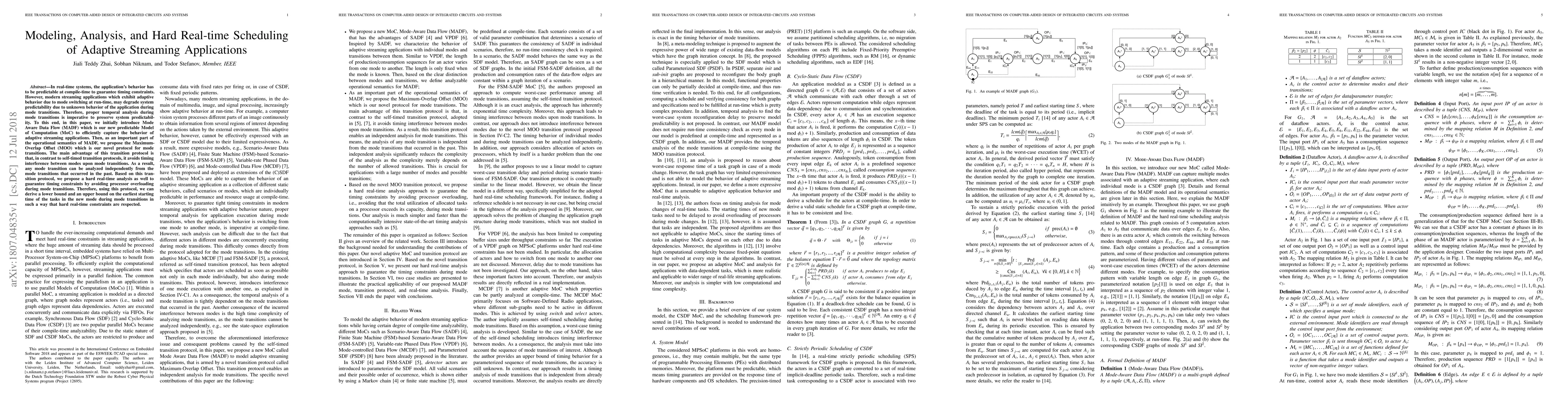 In real-time systems, the application's behavior has to be predictable at compile-time to guarantee timing constraints. However, modern streaming applications which exhibit adaptive behavior due to mode switching at run-time, may degrade system predictability due to unknown behavior of the application during mode transitions. Therefore, proper temporal analysis during mode transitions is imperative to preserve system predictability. To this end, in this paper, we initially introduce Mode Aware Data Flow (MADF) which is our new predictable Model of Computation (MoC) to efficiently capture the behavior of adaptive streaming applications. Then, as an important part of the operational semantics of MADF, we propose the Maximum-Overlap Offset (MOO) which is our novel protocol for mode transitions. The main advantage of this transition protocol is that, in contrast to self-timed transition protocols, it avoids timing interference between modes upon mode transitions. As a result, any mode transition can be analyzed independently from the mode transitions that occurred in the past. Based on this transition protocol, we propose a hard real-time analysis as well to guarantee timing constraints by avoiding processor overloading during mode transitions. Therefore, using this protocol, we can derive a lower bound and an upper bound on the earliest starting time of the tasks in the new mode during mode transitions in such a way that hard real-time constraints are respected.
