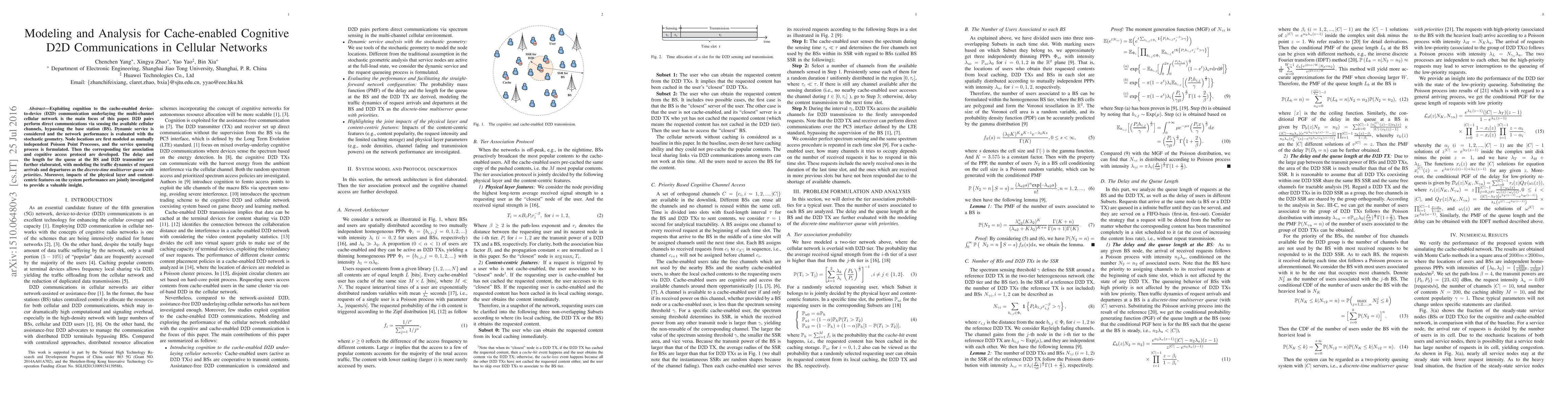 The paper presents a stochastic geometry-based model for cache-enabled cognitive D2D communications in cellular networks, including tier association, cognitive access protocols, and queueing analysis.
