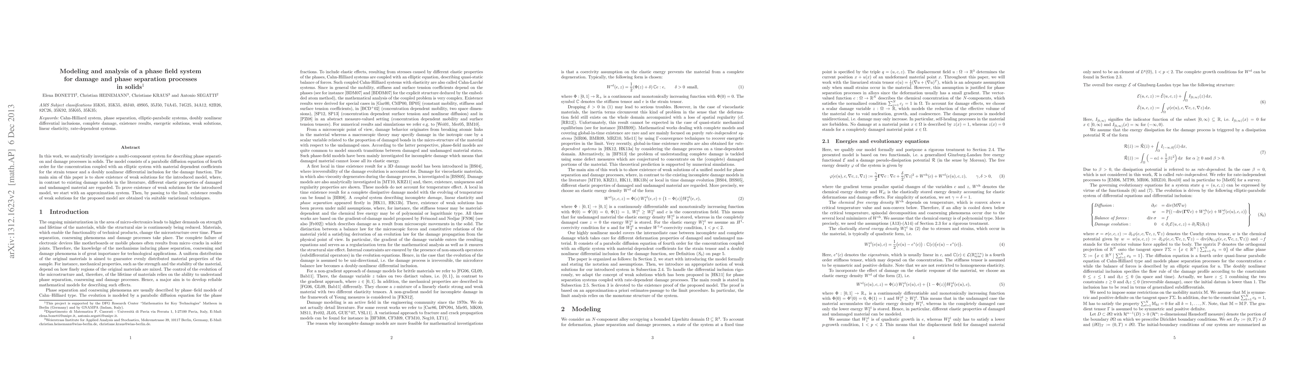 This paper analytically investigates a multi-component phase field model for phase separation and damage processes in solids, incorporating different elastic properties for damaged and undamaged materials. It proves the existence of weak solutions using variational techniques after establishing an approximation system.