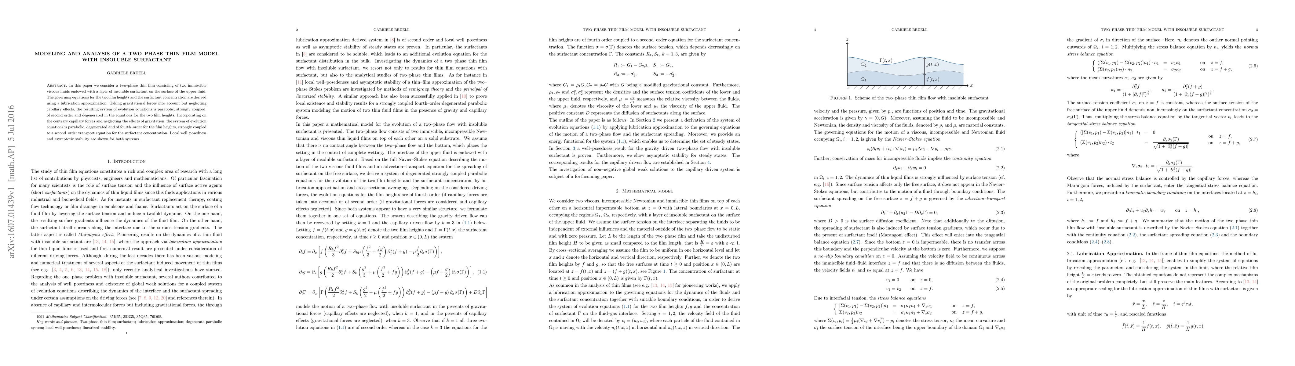 This paper models a two-phase thin film with insoluble surfactant using lubrication approximation, deriving two coupled parabolic systems of evolution equations under gravitational and capillary force considerations. Local well-posedness and asymptotic stability are proven for both systems.