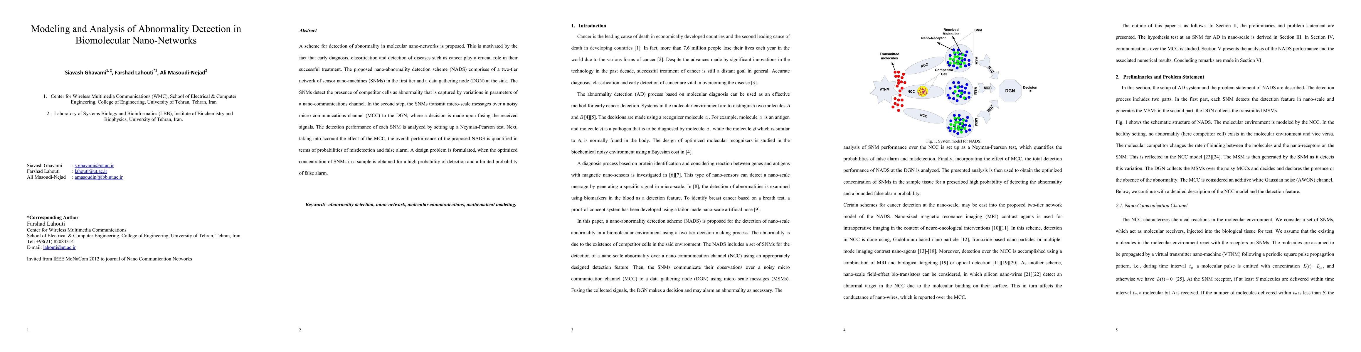 A scheme for detection of abnormality in molecular nano-networks is proposed. This is motivated by the fact that early diagnosis, classification and detection of diseases such as cancer play a crucial role in their successful treatment. The proposed nano-abnormality detection scheme (NADS) comprises of a two-tier network of sensor nano-machines (SNMs) in the first tier and a data gathering node (DGN) at the sink. The SNMs detect the presence of competitor cells as abnormality that is captured by variations in parameters of a nano-communications channel. In the second step, the SNMs transmit micro-scale messages over a noisy micro communications channel (MCC) to the DGN, where a decision is made upon fusing the received signals. The detection performance of each SNM is analyzed by setting up a Neyman-Pearson test. Next, taking into account the effect of the MCC, the overall performance of the proposed NADS is quantified in terms of probabilities of misdetection and false alarm. A design problem is formulated, when the optimized concentration of SNMs in a sample is obtained for a high probability of detection and a limited probability of false alarm.