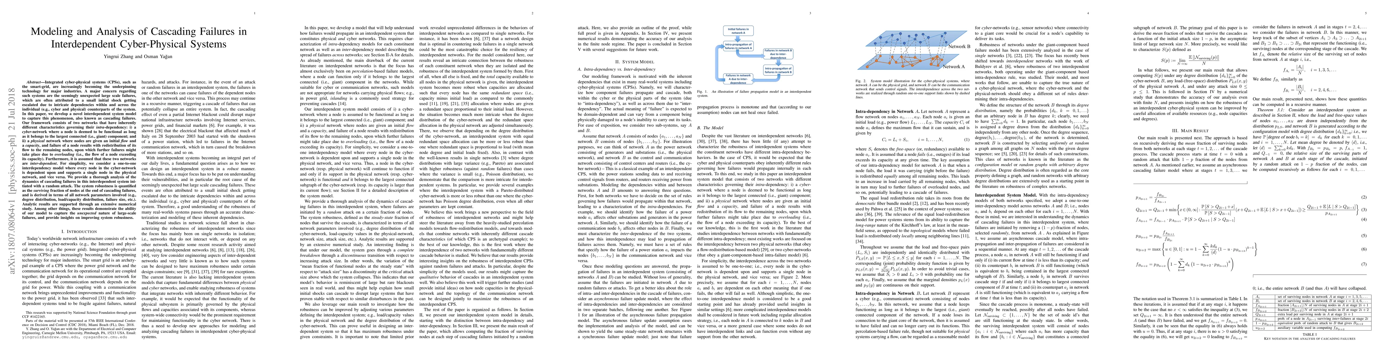 This paper develops a novel model for cascading failures in interdependent cyber-physical systems, analyzing the dynamics through a framework of two networks: a cyber-network and a physical network. The study reveals insights into system robustness and unexpected large-scale failures, supported by both analytic and numerical methods.