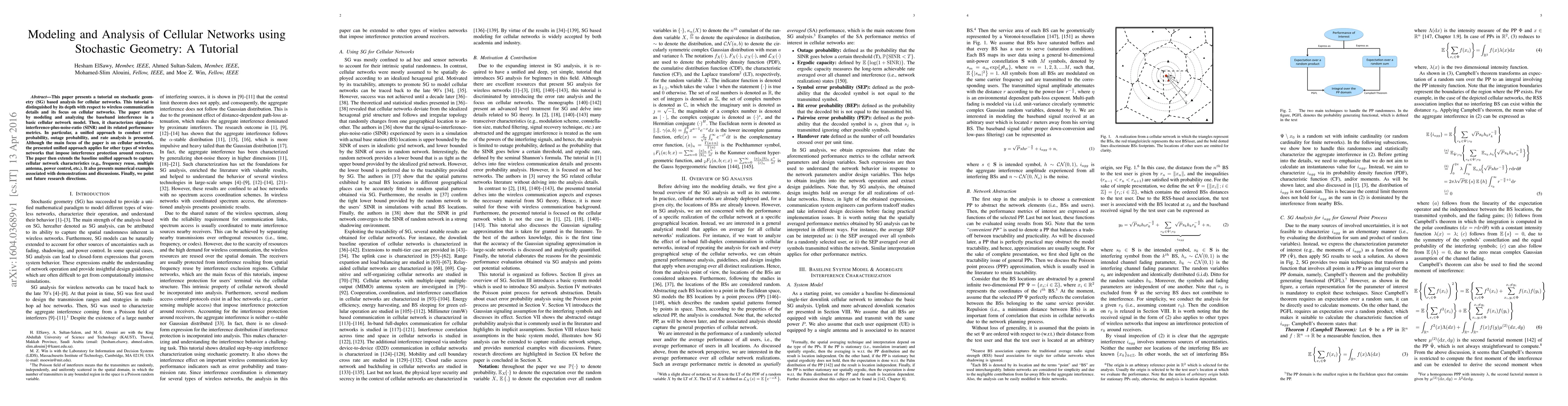 This paper provides a comprehensive tutorial on using stochastic geometry for analyzing cellular networks, focusing on interference modeling, signal-to-interference-plus-noise ratio (SINR) characterization, and unified performance metrics analysis. It extends the approach to include cellular network specifics and concludes with future research suggestions.