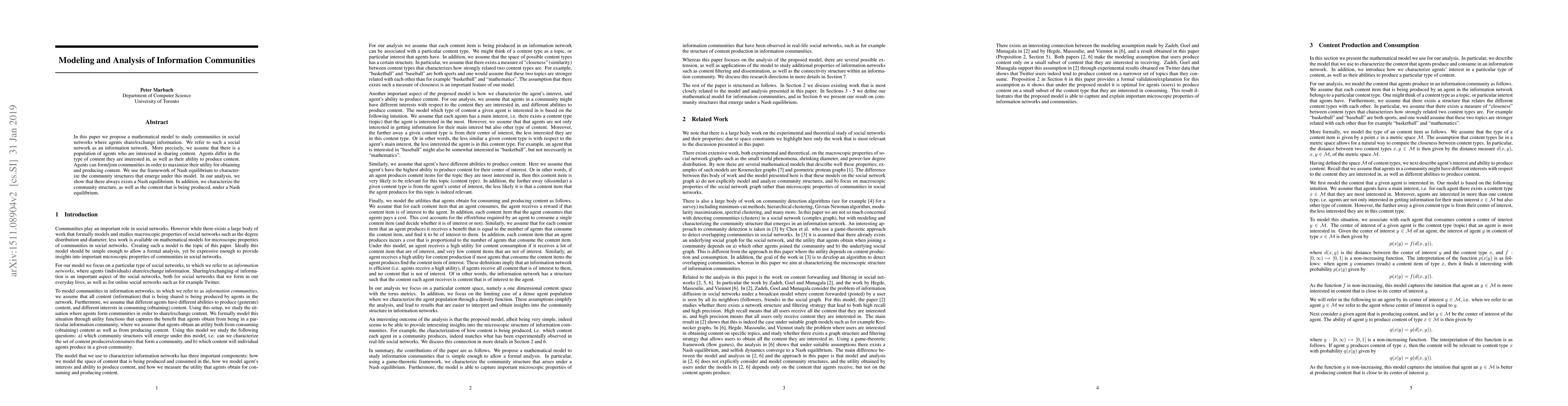This paper proposes a mathematical model to study the formation and structure of information communities in social networks. The model considers agents with different content interests forming communities to maximize utility, and it reveals key properties of these communities.