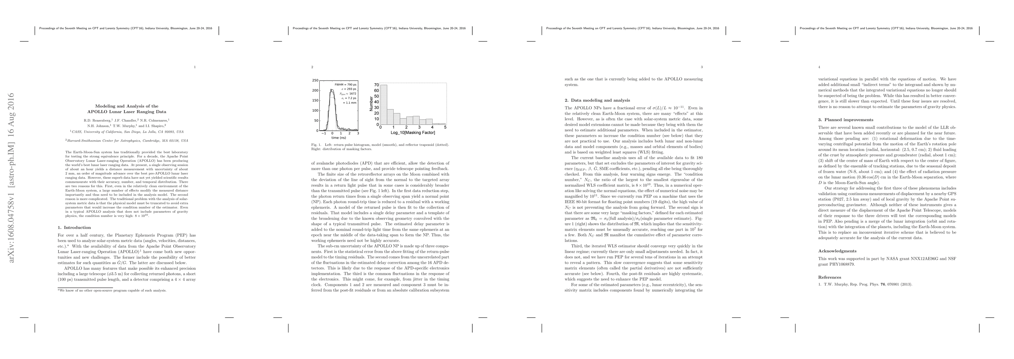 The Earth-Moon-Sun system has traditionally provided the best laboratory for testing the strong equivalence principle. For a decade, the Apache Point Observatory Lunar Laser-ranging Operation (APOLLO) has been producing the world's best lunar laser ranging data. At present, a single observing session of about an hour yields a distance measurement with uncertainty of about 2~mm, an order of magnitude advance over the best pre-APOLLO lunar laser ranging data. However, these superb data have not yet yielded scientific results commensurate with their accuracy, number, and temporal distribution. There are two reasons for this. First, even in the relatively clean environment of the Earth-Moon system, a large number of effects modify the measured distance importantly and thus need to be included in the analysis model. The second reason is more complicated. The traditional problem with the analysis of solar-system metric data is that the physical model must be truncated to avoid extra parameters that would increase the condition number of the estimator. Even in a typical APOLLO analysis that does not include parameters of gravity physics, the condition number is very high: $8 \times 10^{10}$.