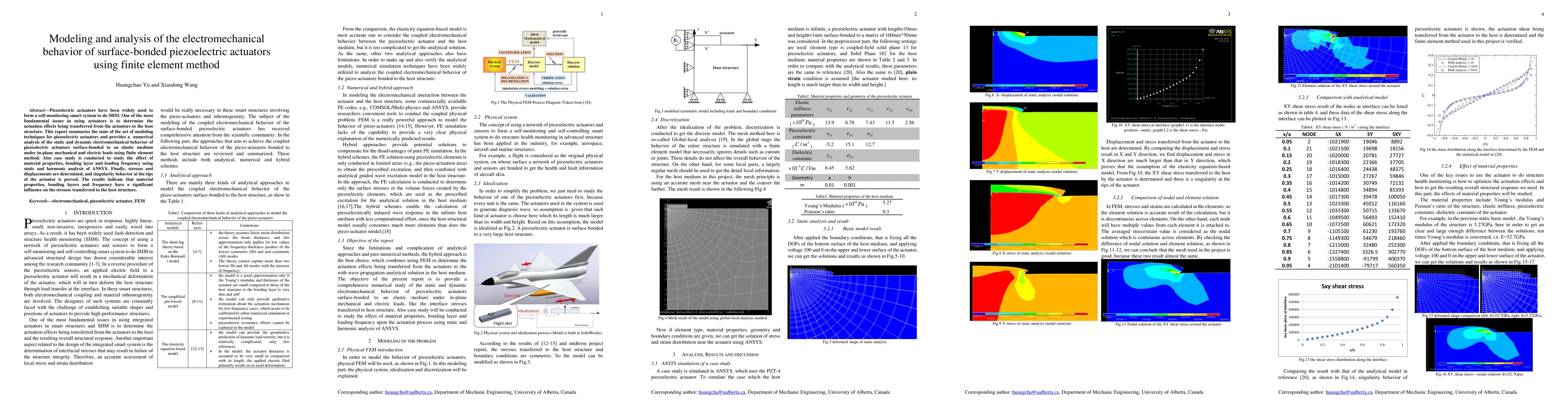 This paper models the electromechanical behavior of piezoelectric actuators using finite element methods, focusing on static and dynamic responses under various loads. Results show significant influences of material properties, bonding layers, and frequency on the stresses and displacements transferred to the host structure.
