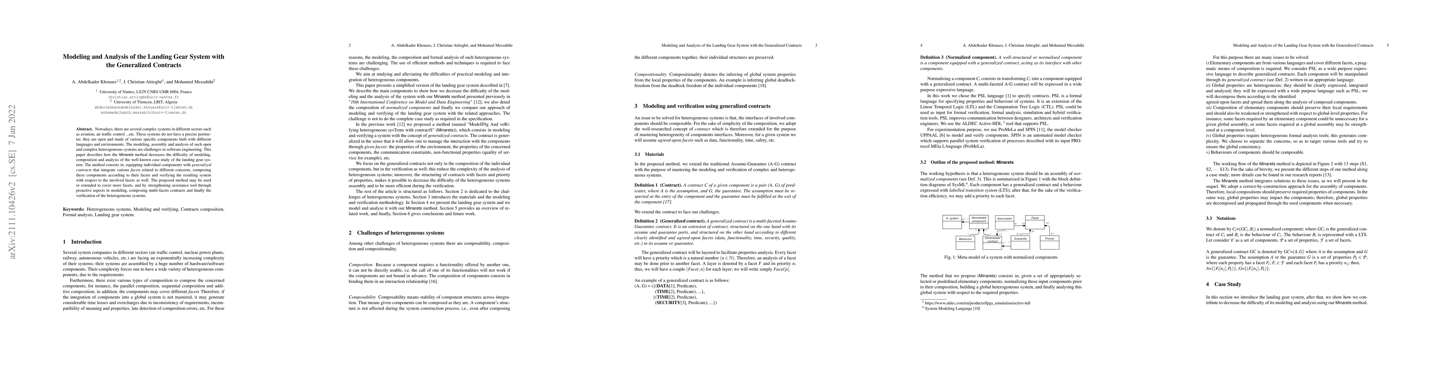 This paper introduces a method called Generalized Contracts to model and analyze complex systems like the landing gear system in aviation. It simplifies modeling, composition, and analysis by integrating various facets of components into individual contracts.