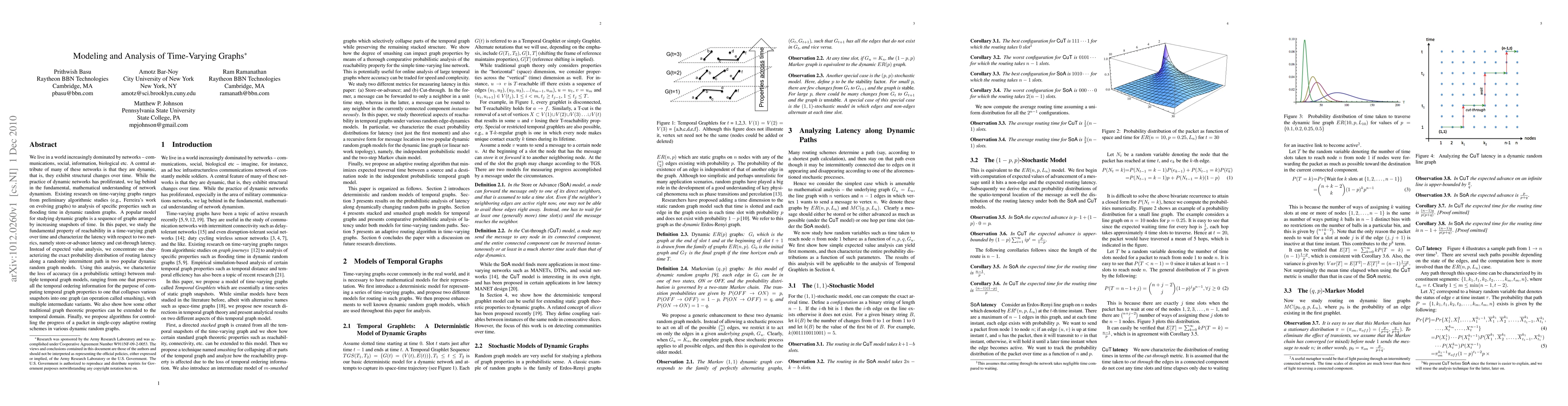 We live in a world increasingly dominated by networks -- communications, social, information, biological etc. A central attribute of many of these networks is that they are dynamic, that is, they exhibit structural changes over time. While the practice of dynamic networks has proliferated, we lag behind in the fundamental, mathematical understanding of network dynamism. Existing research on time-varying graphs ranges from preliminary algorithmic studies (e.g., Ferreira's work on evolving graphs) to analysis of specific properties such as flooding time in dynamic random graphs. A popular model for studying dynamic graphs is a sequence of graphs arranged by increasing snapshots of time. In this paper, we study the fundamental property of reachability in a time-varying graph over time and characterize the latency with respect to two metrics, namely store-or-advance latency and cut-through latency. Instead of expected value analysis, we concentrate on characterizing the exact probability distribution of routing latency along a randomly intermittent path in two popular dynamic random graph models. Using this analysis, we characterize the loss of accuracy (in a probabilistic setting) between multiple temporal graph models, ranging from one that preserves all the temporal ordering information for the purpose of computing temporal graph properties to one that collapses various snapshots into one graph (an operation called smashing), with multiple intermediate variants. We also show how some other traditional graph theoretic properties can be extended to the temporal domain. Finally, we propose algorithms for controlling the progress of a packet in single-copy adaptive routing schemes in various dynamic random graphs.