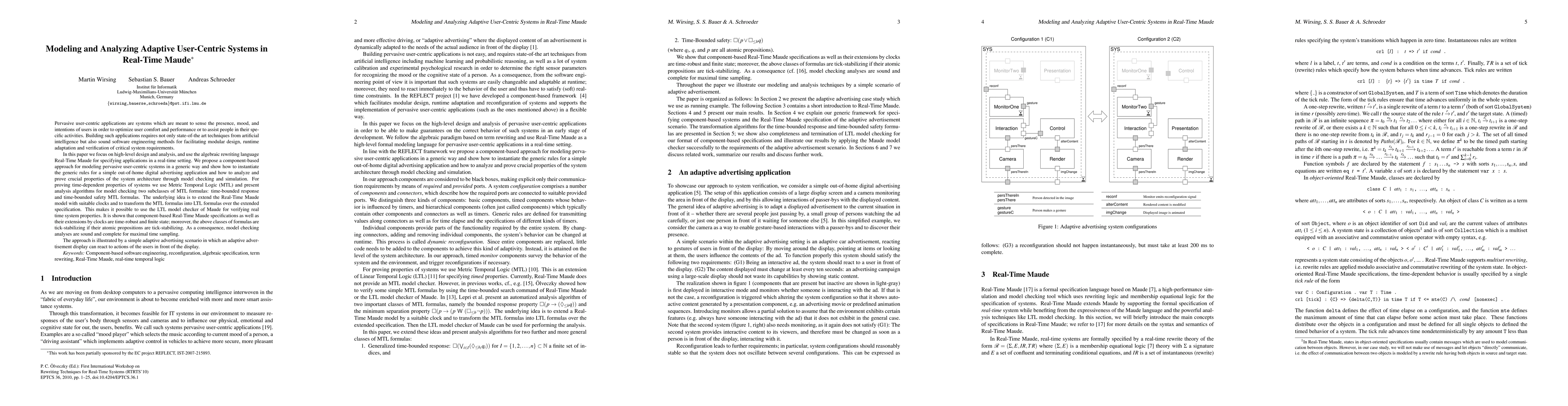 Pervasive user-centric applications are systems which are meant to sense the presence, mood, and intentions of users in order to optimize user comfort and performance. Building such applications requires not only state-of-the art techniques from artificial intelligence but also sound software engineering methods for facilitating modular design, runtime adaptation and verification of critical system requirements. In this paper we focus on high-level design and analysis, and use the algebraic rewriting language Real-Time Maude for specifying applications in a real-time setting. We propose a generic component-based approach for modeling pervasive user-centric systems and we show how to analyze and prove crucial properties of the system architecture through model checking and simulation. For proving time-dependent properties we use Metric Temporal Logic (MTL) and present analysis algorithms for model checking two subclasses of MTL formulas: time-bounded response and time-bounded safety MTL formulas. The underlying idea is to extend the Real-Time Maude model with suitable clocks, to transform the MTL formulas into LTL formulas over the extended specification, and then to use the LTL model checker of Maude. It is shown that these analyses are sound and complete for maximal time sampling. The approach is illustrated by a simple adaptive advertising scenario in which an adaptive advertisement display can react to actions of the users in front of the display.