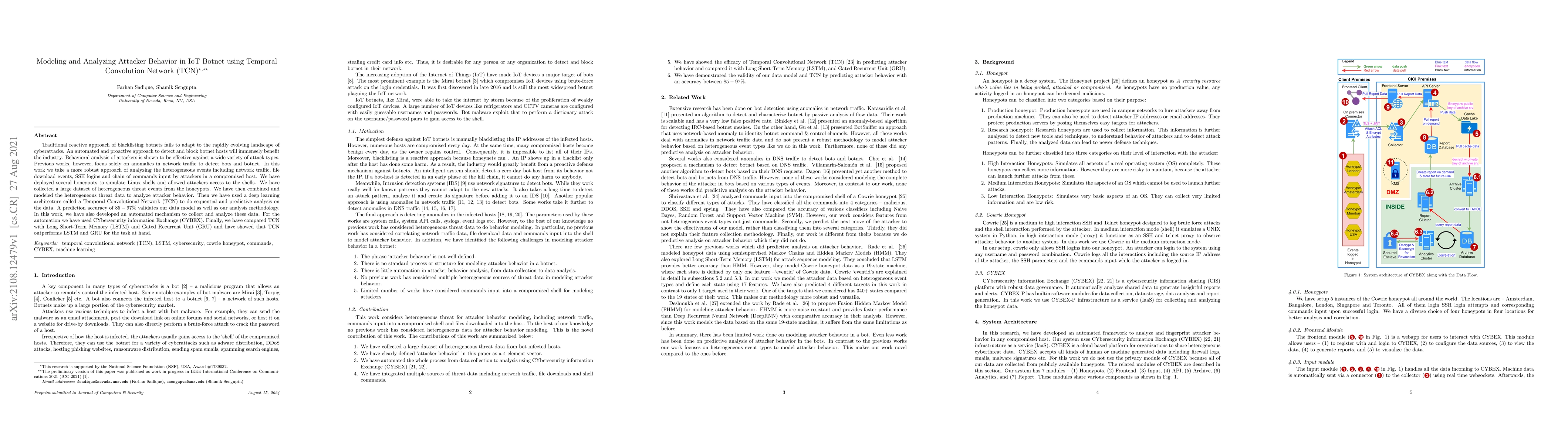 Traditional reactive approach of blacklisting botnets fails to adapt to the rapidly evolving landscape of cyberattacks. An automated and proactive approach to detect and block botnet hosts will immensely benefit the industry. Behavioral analysis of attackers is shown to be effective against a wide variety of attack types. Previous works, however, focus solely on anomalies in network traffic to detect bots and botnet. In this work we take a more robust approach of analyzing the heterogeneous events including network traffic, file download events, SSH logins and chain of commands input by attackers in a compromised host. We have deployed several honeypots to simulate Linux shells and allowed attackers access to the shells. We have collected a large dataset of heterogeneous threat events from the honeypots. We have then combined and modeled the heterogeneous threat data to analyze attacker behavior. Then we have used a deep learning architecture called a Temporal Convolutional Network (TCN) to do sequential and predictive analysis on the data. A prediction accuracy of $85-97\%$ validates our data model as well as our analysis methodology. In this work, we have also developed an automated mechanism to collect and analyze these data. For the automation we have used CYbersecurity information Exchange (CYBEX). Finally, we have compared TCN with Long Short-Term Memory (LSTM) and Gated Recurrent Unit (GRU) and have showed that TCN outperforms LSTM and GRU for the task at hand.