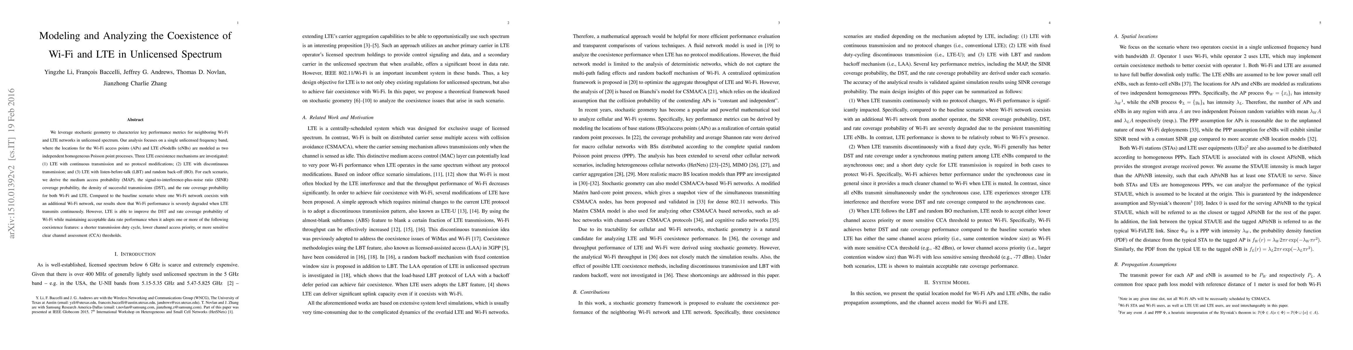 This paper uses stochastic geometry to analyze the coexistence of Wi-Fi and LTE networks in the unlicensed spectrum, evaluating three LTE coexistence mechanisms. It finds that continuous LTE transmission degrades Wi-Fi performance, but adopting discontinuous transmission, listen-before-talk, or more sensitive clear channel assessment can improve Wi-Fi's density and rate coverage while maintaining LTE performance.