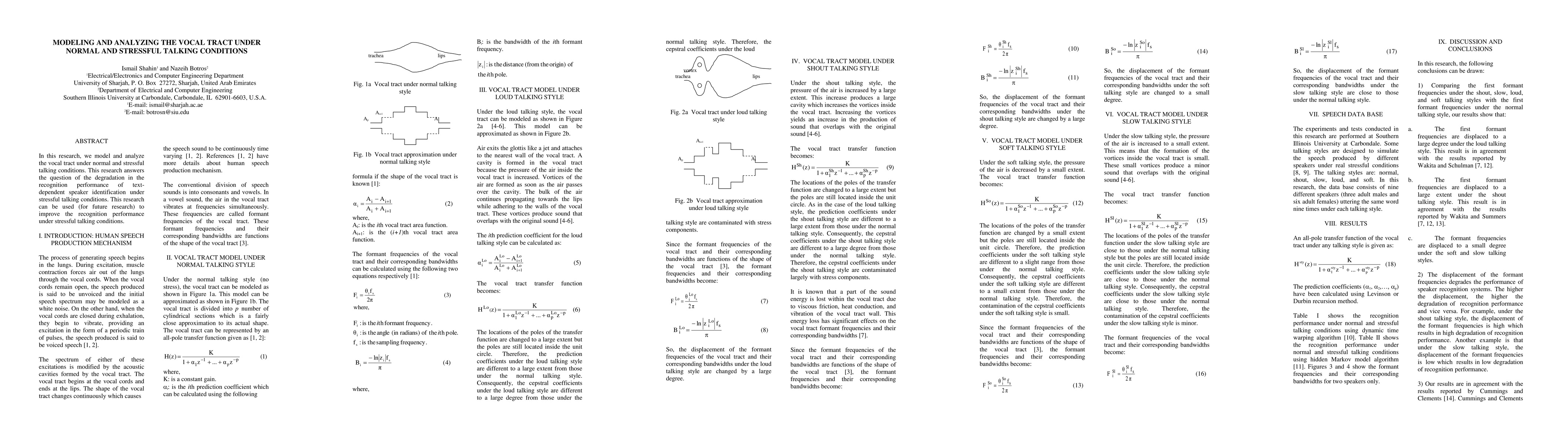 In this research, we model and analyze the vocal tract under normal and stressful talking conditions. This research answers the question of the degradation in the recognition performance of text-dependent speaker identification under stressful talking conditions. This research can be used (for future research) to improve the recognition performance under stressful talking conditions.