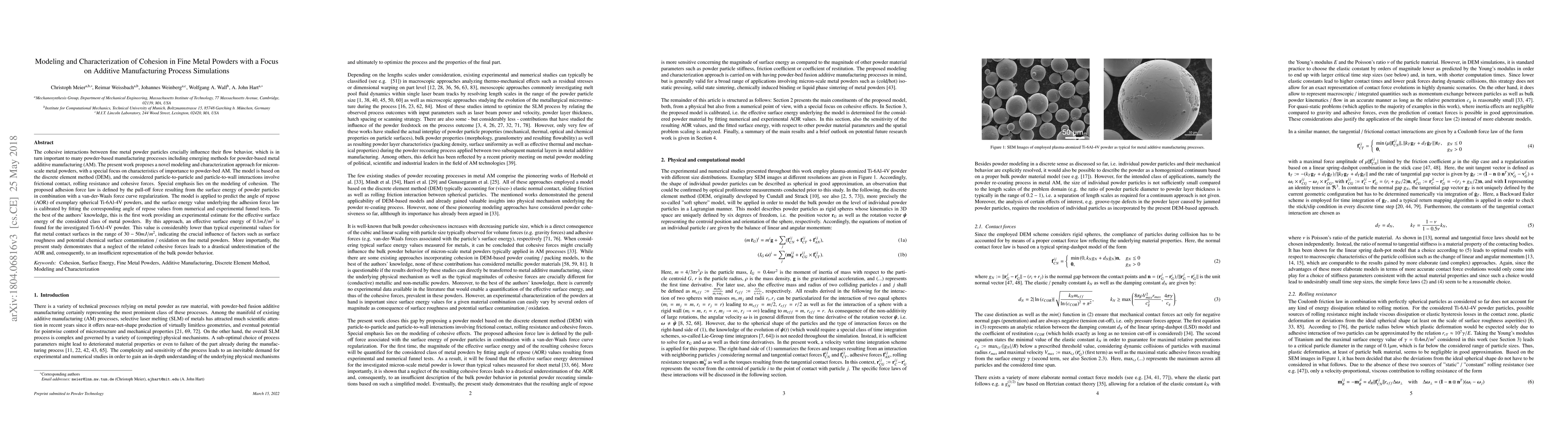 This paper proposes a novel discrete element method (DEM) model to characterize cohesive interactions in fine metal powders, focusing on additive manufacturing simulations. The model accurately predicts the angle of repose for Ti-6Al-4V powders, revealing a significantly lower effective surface energy of $0.1mJ/m^2$ compared to typical flat metal surfaces, highlighting the importance of cohesive forces in powder behavior.