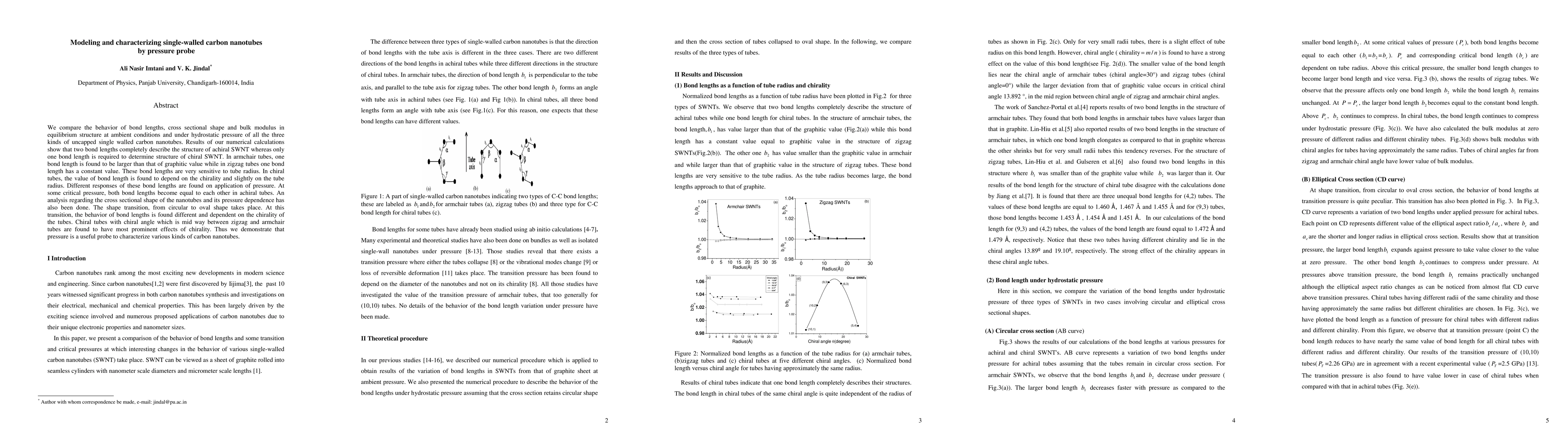 This study investigates the structural changes in single-walled carbon nanotubes (SWNTs) under hydrostatic pressure, revealing that two bond lengths characterize achiral SWNTs, while only one is needed for chiral SWNTs. Pressure induces shape transitions from circular to oval and equalizes bond lengths in achiral tubes at a critical pressure, highlighting pressure as a useful tool for characterizing SWNT structures.