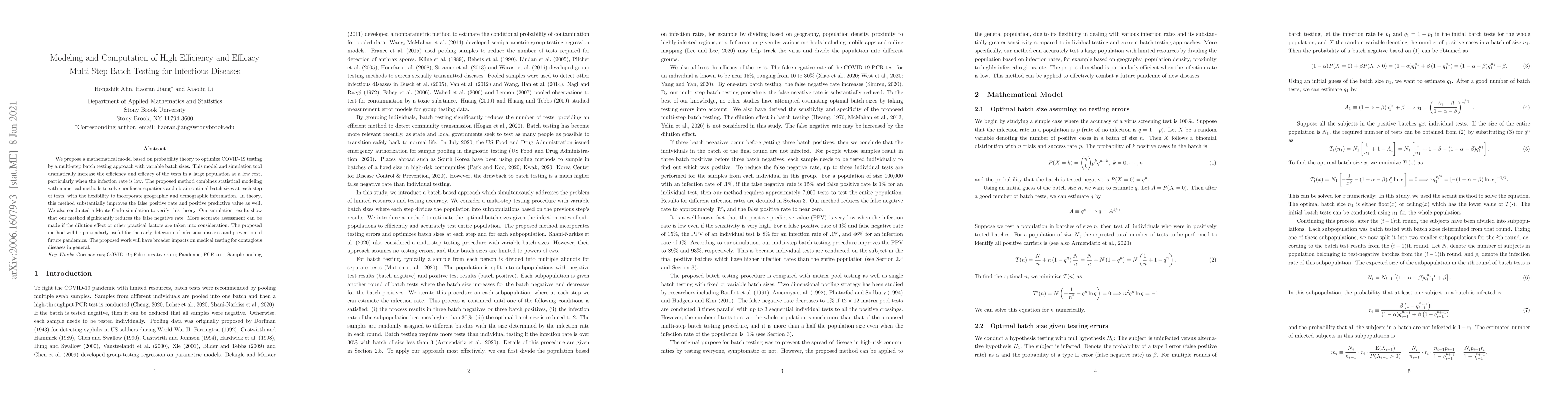 This paper proposes a mathematical model for optimizing COVID-19 testing through a multi-step batch testing approach, significantly improving efficiency and efficacy, especially at low infection rates. The model combines statistical and numerical methods, validated by Monte Carlo simulation, to reduce false negatives and enhance early detection and prevention of infectious diseases.
