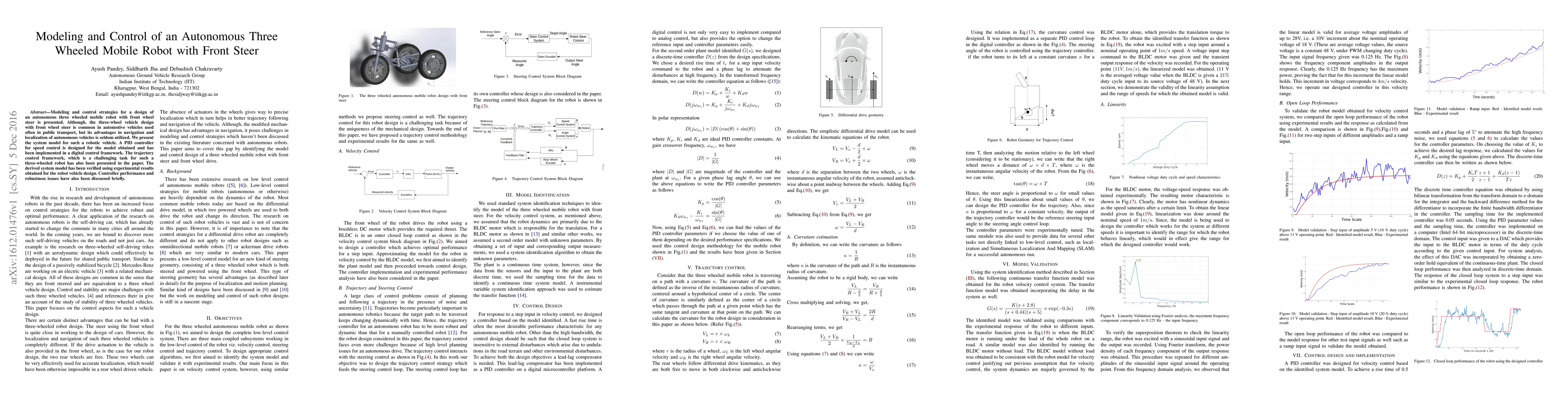 Modeling and control strategies for a design of an autonomous three wheeled mobile robot with front wheel steer is presented. Although, the three-wheel vehicle design with front wheel steer is common in automotive vehicles used often in public transport, but its advantages in navigation and localization of autonomous vehicles is seldom utilized. We present the system model for such a robotic vehicle. A PID controller for speed control is designed for the model obtained and has been implemented in a digital control framework. The trajectory control framework, which is a challenging task for such a three-wheeled robot has also been presented in the paper. The derived system model has been verified using experimental results obtained for the robot vehicle design. Controller performance and robustness issues have also been discussed briefly.