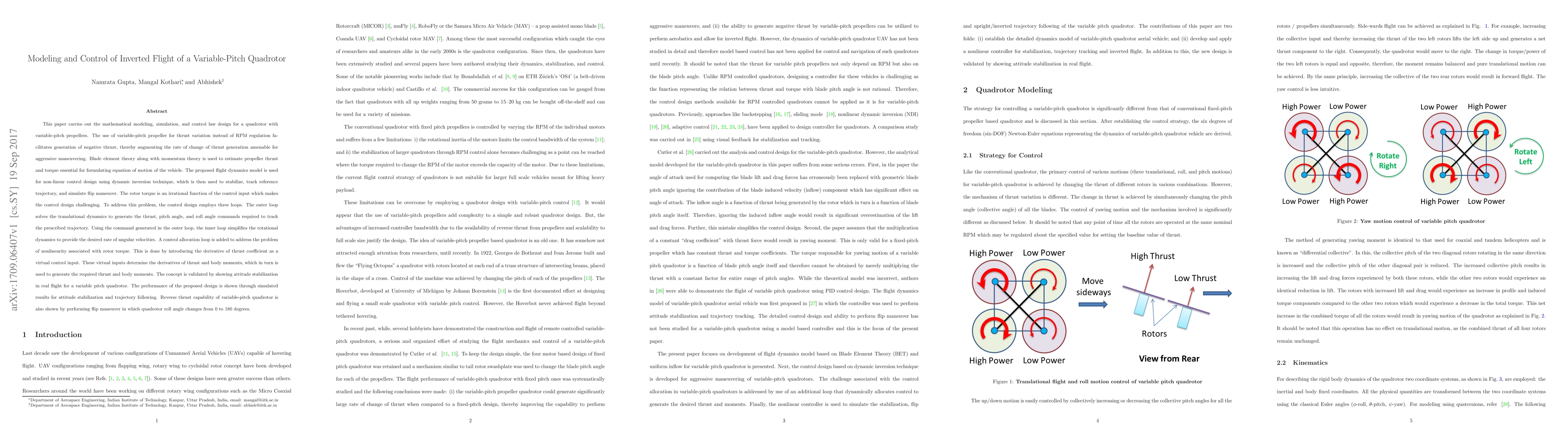This paper carries out the mathematical modeling, simulation, and control law design for a quadrotor with variable-pitch propellers. The use of variable-pitch propeller for thrust variation instead of RPM regulation facilitates generation of negative thrust, thereby augmenting the rate of change of thrust generation amenable for aggressive maneuvering. Blade element theory along with momentum theory is used to estimate propeller thrust and torque essential for formulating equation of motion of the vehicle. The proposed flight dynamics model is used for non-linear control design using dynamic inversion technique, which is then used to stabilize, track reference trajectory, and simulate flip maneuver. The rotor torque is an irrational function of the control input which makes the control design challenging. To address this problem, the control design employs three loops. The outer loop solves the translational dynamics to generate the thrust, pitch angle, and roll angle commands required to track the prescribed trajectory. Using the command generated in the outer loop, the inner loop simplifies the rotational dynamics to provide the desired rate of angular velocities. A control allocation loop is added to address the problem of nonlinearity associated with rotor torque. This is done by introducing the derivative of thrust coefficient as a virtual control input. These virtual inputs determine the derivatives of thrust and body moments, which in turn is used to generate the required thrust and body moments. The concept is validated by showing attitude stabilization in real flight for a variable pitch quadrotor. The performance of the proposed design is shown through simulated results for attitude stabilization and trajectory following. Reverse thrust capability of variable-pitch quadrotor is also shown by performing flip maneuver in which quadrotor roll angle changes from 0 to 180 degrees.