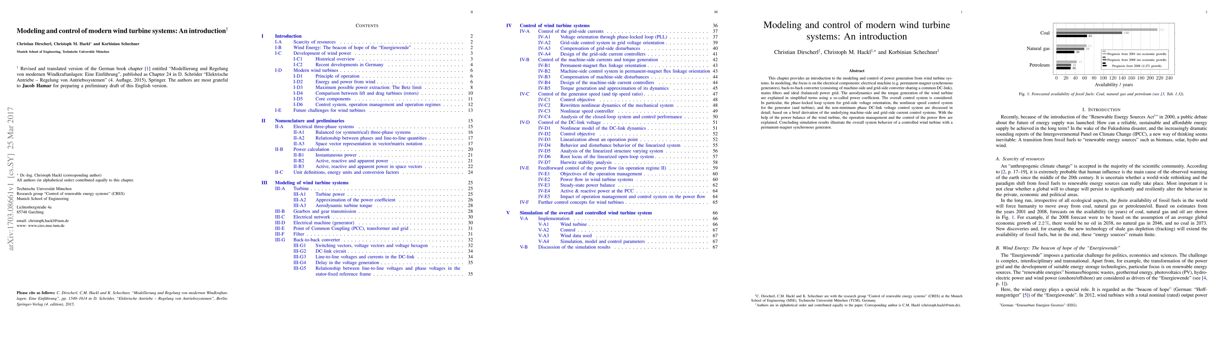 This chapter provides an introduction to the modeling and control of power generation from wind turbine systems. In modeling, the focus is on the electrical components: electrical machine (e.g. permanent-magnet synchronous generators), back-to-back converter (consisting of machine-side and grid-side converter sharing a common DC-link), mains filters and ideal (balanced) power grid. The aerodynamics and the torque generation of the wind turbine are explained in simplified terms using a so-called power coefficient. The overall control system is considered. In particular, the phase-locked loop system for grid-side voltage orientation, the nonlinear speed control system for the generator (and turbine), and the non-minimum phase DC-link voltage control system are discussed in detail; based on a brief derivation of the underlying machine-side and grid-side current control systems. With the help of the power balance of the wind turbine, the operation management and the control of the power flow are explained. Concluding simulation results illustrate the overall system behavior of a controlled wind turbine with a permanent-magnet synchronous generator.