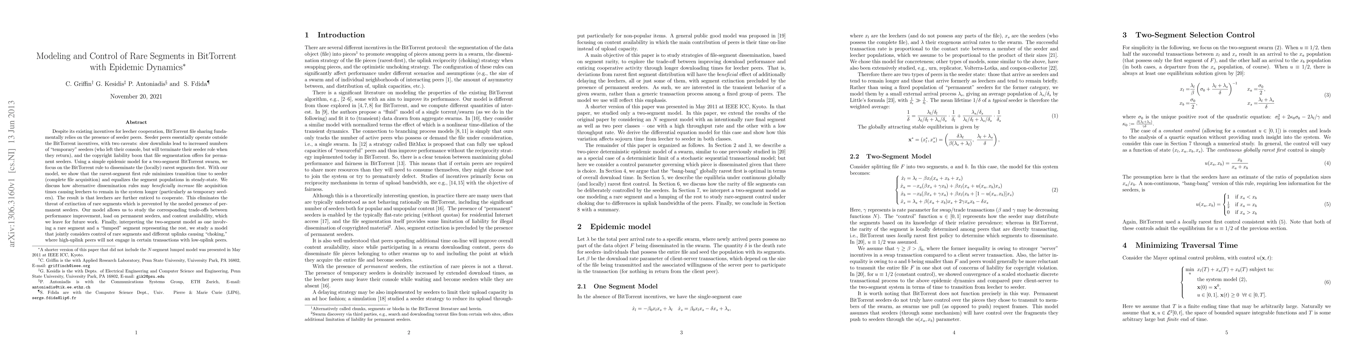 This paper models and controls rare segments in BitTorrent using an epidemic dynamics approach, focusing on the rule to prioritize the rarest segments for dissemination. It demonstrates that this rule minimizes transition time to complete file acquisition and equalizes segment populations, while alternative rules may prolong file acquisition, encouraging leecher cooperation and preventing rare segment extinction.