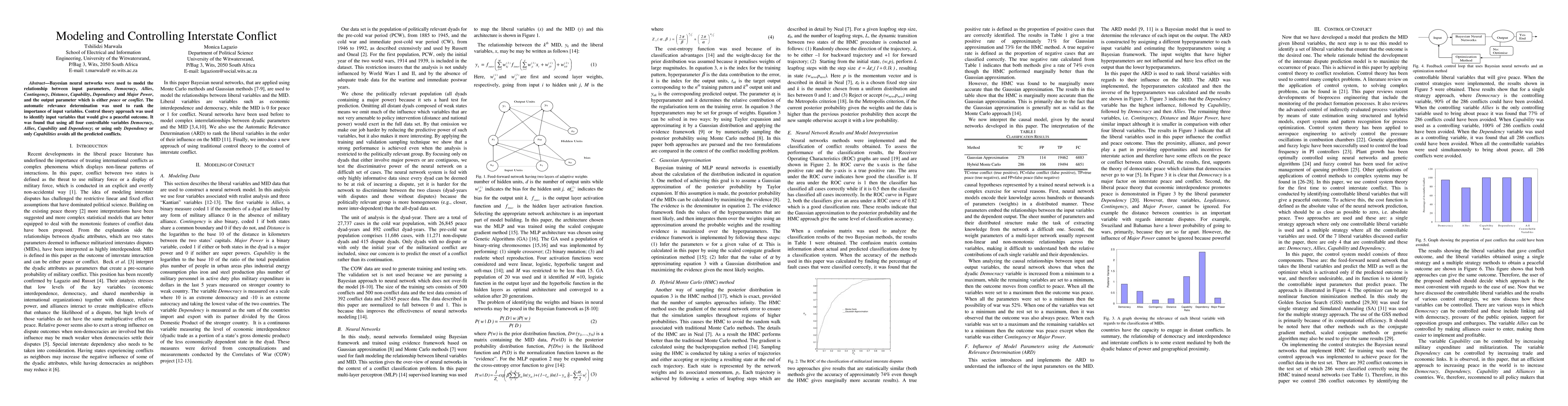 Bayesian neural networks were used to model the relationship between input parameters, Democracy, Allies, Contingency, Distance, Capability, Dependency and Major Power, and the output parameter which is either peace or conflict. The automatic relevance determination was used to rank the importance of input variables. Control theory approach was used to identify input variables that would give a peaceful outcome. It was found that using all four controllable variables Democracy, Allies, Capability and Dependency; or using only Dependency or only Capabilities avoids all the predicted conflicts.