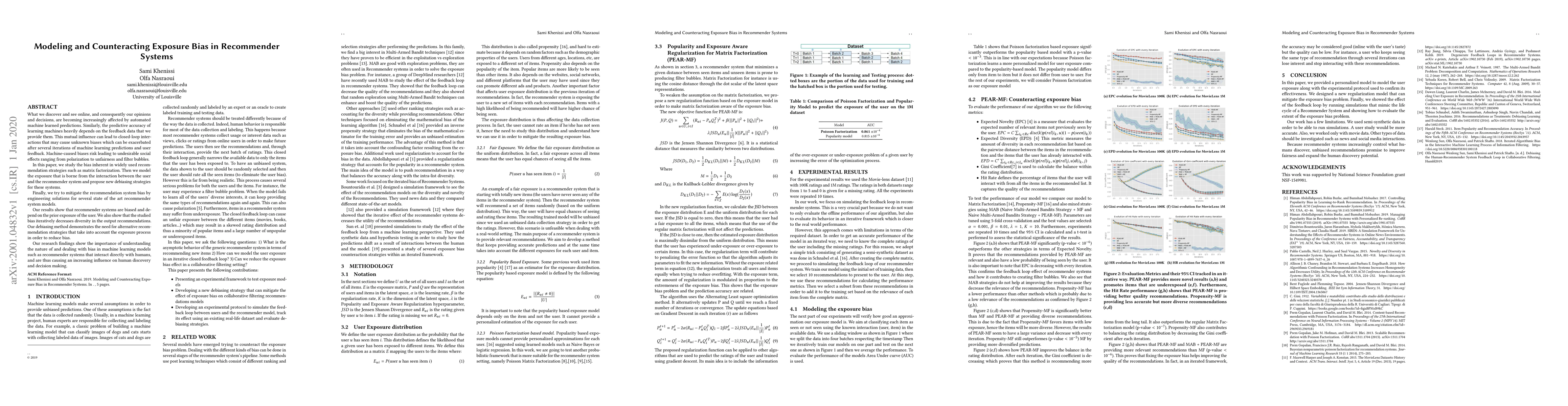 What we discover and see online, and consequently our opinions and decisions, are becoming increasingly affected by automated machine learned predictions. Similarly, the predictive accuracy of learning machines heavily depends on the feedback data that we provide them. This mutual influence can lead to closed-loop interactions that may cause unknown biases which can be exacerbated after several iterations of machine learning predictions and user feedback. Machine-caused biases risk leading to undesirable social effects ranging from polarization to unfairness and filter bubbles. In this paper, we study the bias inherent in widely used recommendation strategies such as matrix factorization. Then we model the exposure that is borne from the interaction between the user and the recommender system and propose new debiasing strategies for these systems. Finally, we try to mitigate the recommendation system bias by engineering solutions for several state of the art recommender system models. Our results show that recommender systems are biased and depend on the prior exposure of the user. We also show that the studied bias iteratively decreases diversity in the output recommendations. Our debiasing method demonstrates the need for alternative recommendation strategies that take into account the exposure process in order to reduce bias. Our research findings show the importance of understanding the nature of and dealing with bias in machine learning models such as recommender systems that interact directly with humans, and are thus causing an increasing influence on human discovery and decision making